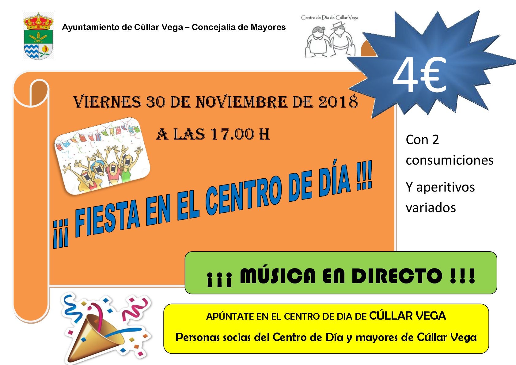 Disfruta de una fantástica Fiesta en el Centro de Día el próximo viernes 30 de noviembre de 2018 a partir de las 17:00 h. Por sólo 4 € y para las Personas Socias del Centro de Día, disfruta de Música en Directo con 2 Consumiciones y aperitivos variados. Más información e Inscripciones en el Centro de Día