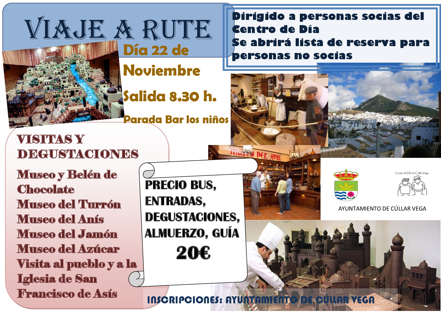 Viaje a Rute para las personas socias del Centro de Día. Será el día 26 de Noviembre de 2018 y el horario de salida será a las 8´30 horas desde la parada de Bus del Bar de los Niños. Precio bus, entradas, degustaciones, almuerzo y guía: 20,00 € Se visitarán el Museo y Belén de Chocolate, Museo del Turrón, Museo