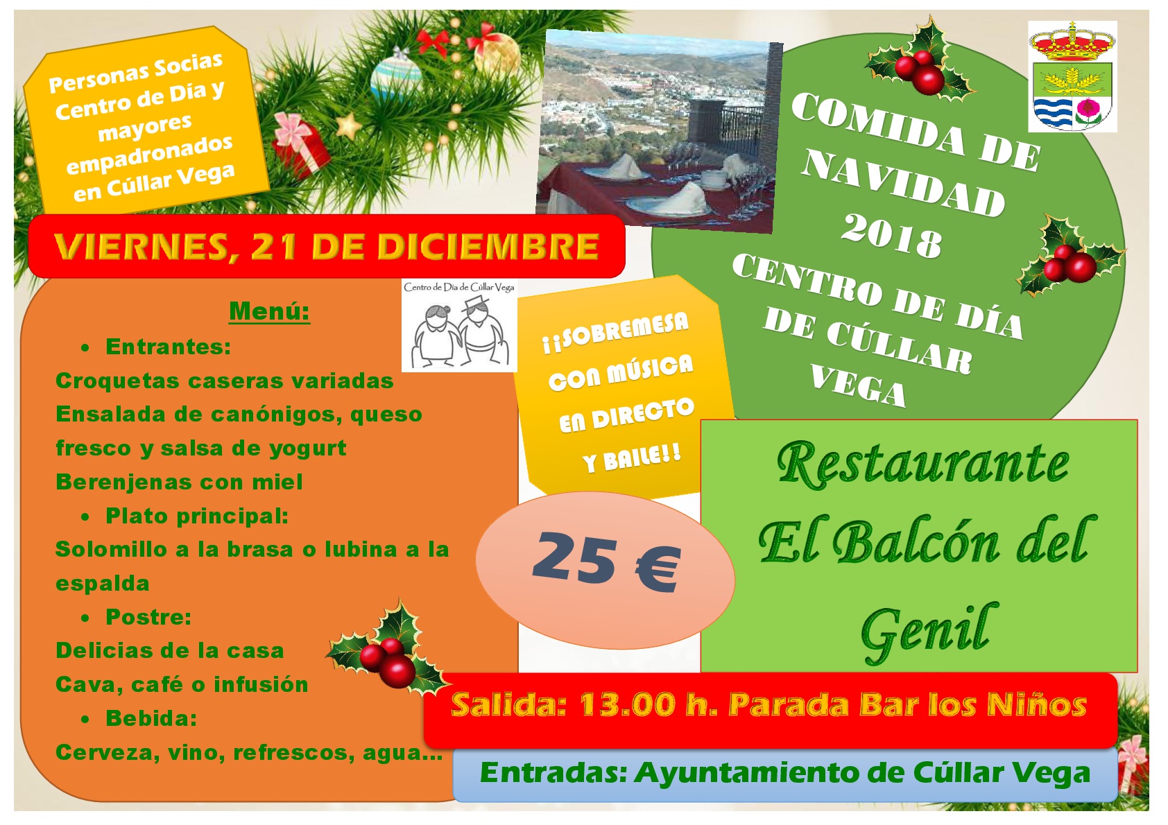 Comida de Navidad 2018 el Viernes 21 de Diciembre en el restaurante El Balcón del Genil con sobremesa con música en directo y baile, personas socias de Centro de Día y mayores empadronados en Cúllar Vega. Entradas: Ayuntamiento de Cúllar Vega Salida: 13:00h. Parada Bar los Niños Menú: Entrantes: Croquetas caseras variadas Ensalada de canónigos, queso fresco y ensalada de