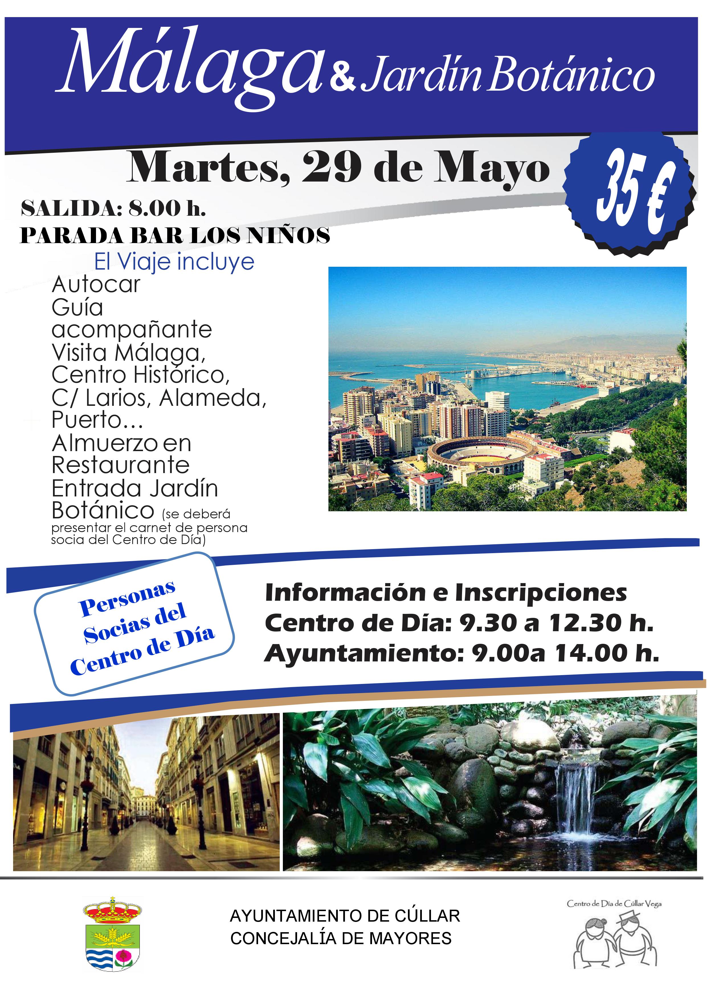 Pasa un día divertido visitando Málaga Fecha: Martes día 29 de Mayo Salida: 8´00 horas desde la Parada del Bar Los Niños Precio: 35,00 € El viaje incluye: Transporte Guía acompañante Visita Málaga, Centro histórico, Calle Larios, Alameda, Puerto Almuerzo en Restaurante Entrada al Jardín Botánico (imprescindible presentar el carnet de soci@ del Centro de Día) Información e