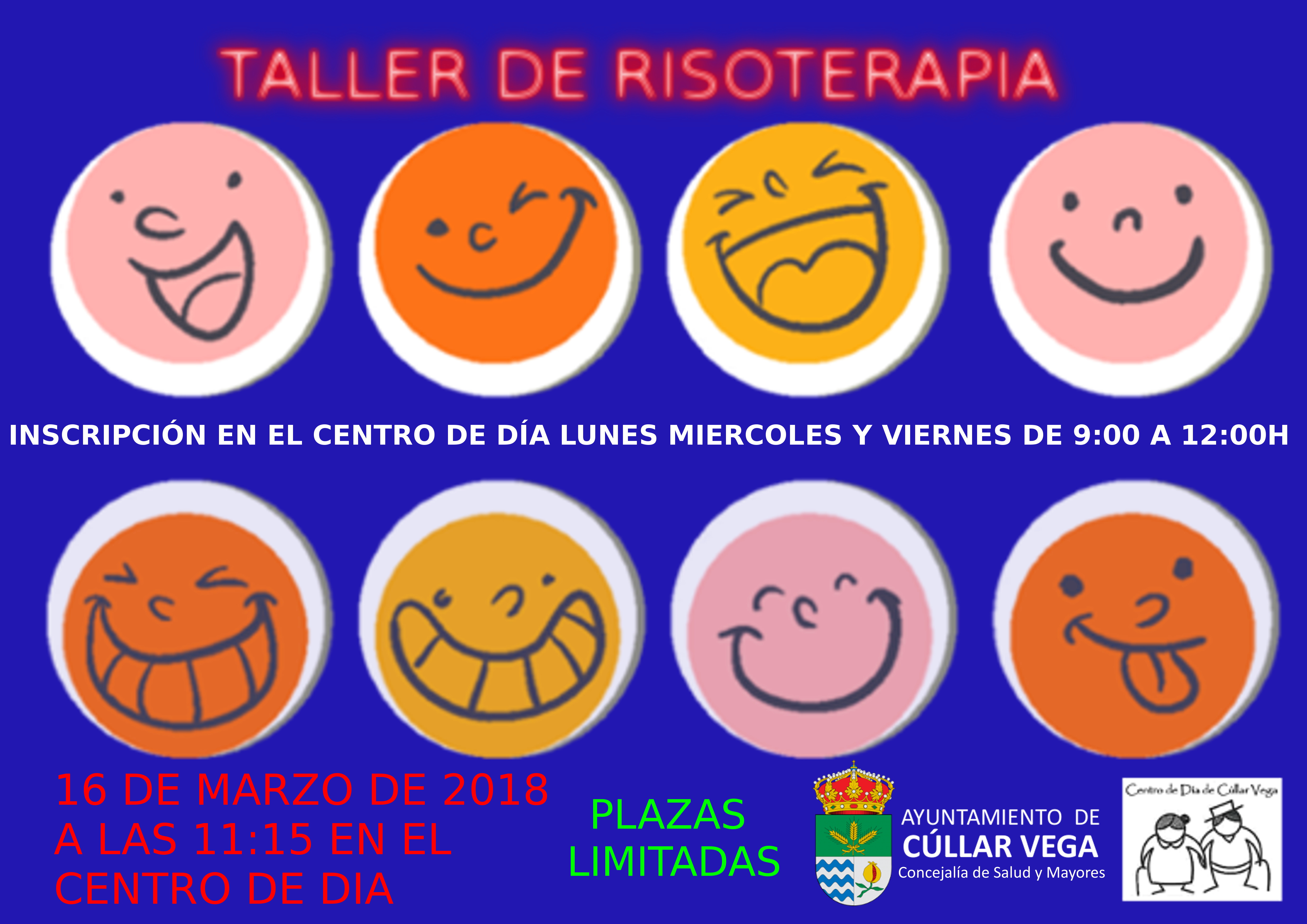 El próximo día 16 de Marzo de 2018 tendrá lugar un nuevo TALLER DE RISOTERAPIA en el Centro de Día de Cúllar Vega. A partir de las 11:00 h podrás disfrutar de este “risueño” taller organizado por la Concejalía de Salud y Mayores del Ayuntamiento de Cúllar Vega y el Centro de Día del citado municipio. Inscripciones Lunes, Miércoles o Viernes de 09:00 a 12:00 h. ¡OS ESPERAMOS!