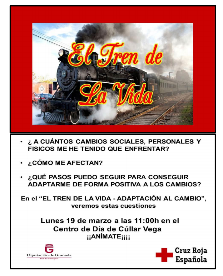 Taller «El Tren de la Vida» en el Centro de Día impartido por Cruz Roja Española con la colaboración de la Diputación de Granada. Si quieres tratar estos temas: ¿ A cuántos cambios sociales, personales y físicos me he tenido que enfrentar? ¿Cómo afectan? ¿Qué pasos puedo seguir para conseguir adaptarme de forma positiva a los cambios? Tendrá lugar el