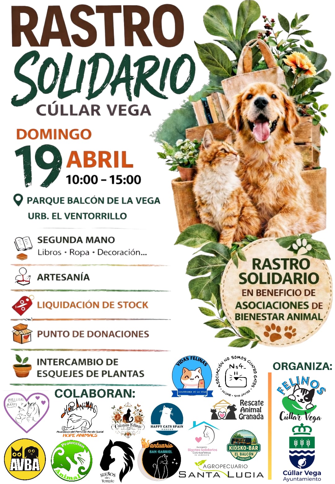 El Ayuntamiento de Cúllar Vega, en colaboración con la asociación Felinos Cúllar Vega, organiza un Rastro Solidario con una causa benéfica fundamental: el apoyo a las protectoras y colectivos que velan por el bienestar animal en nuestra provincia. La cita tendrá lugar el próximo domingo 19 de abril, en horario de 10:00 a 15:00 horas, en el Parque Balcón de