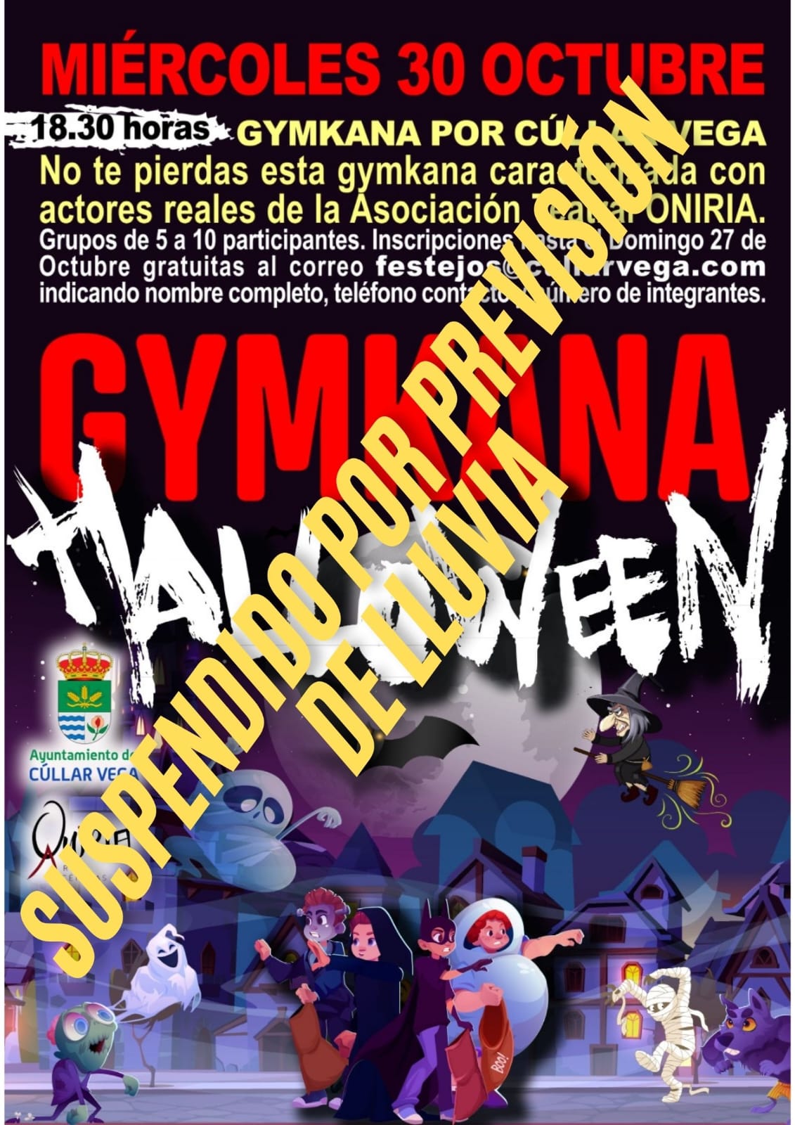 Se cancelan los eventos al AIRE LIBRE que se iban a realizar hoy martes 29 y la Gymkana del 30 de octubre por previsión de lluvia. Se mantiene el pasaje del terror del día 30 y el concurso de ¿Cuánto Sabes de Halloween? que se desarrollará en el Punto Vuela Cúllar Vega y sigue prevista la visita del jurado para