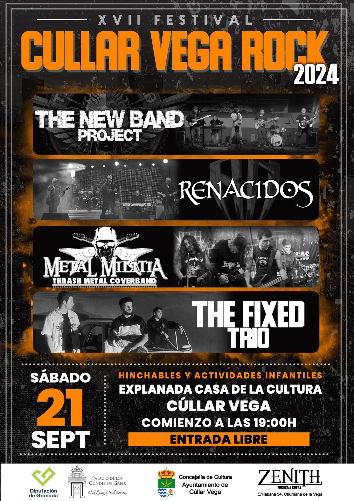 Cúllar Vega acogerá de nuevo, el próximo sábado 21 de septiembre y a partir de las 19:00 h., uno de los pocos festivales musicales completamente gratuitos de la provincia de Granada: el Cúllar Vega Rock que este año cumple 17 años. Este año actuarán The New Band Project, Renacidos, Metal Militia y The Fixed Trio. Tendrá lugar en la explanada
