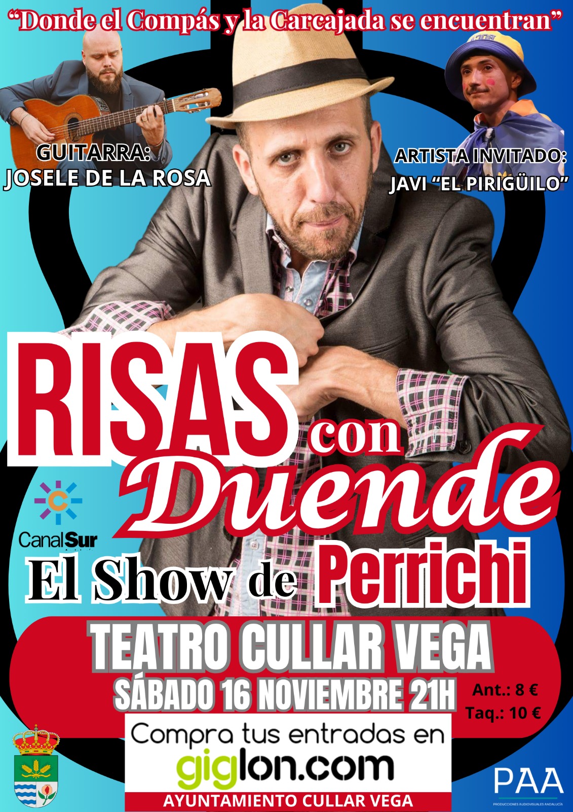 El sábado 16 de noviembre viene El Show de Perrichi a Cúllar Vega con «RISAS CON DUENDE», donde el compás y la carcajada se encuentran. Contará además con Josele de la Rosa a la guitarra y Javi «El Pirigüilo» como artista invitado. Compra tus entradas en: https://www.giglon.com/todos?idEvent=risas-con-duende-cullar-vega