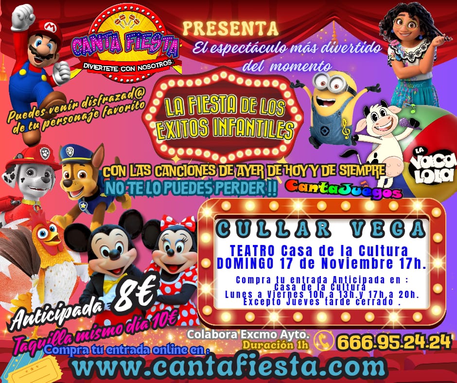 El domingo 17 de noviembre, a las 17 h. y en la Casa de la Cultura, para un momento inolvidable con las canciones de ayer, de hoy y de siempre en el espectáculo más divertido del momento. Puedes venir disfrazado de tu personaje favorito. Compra tu entrada anticipada en la Casa de la Cultura de lunes a viernes de 10