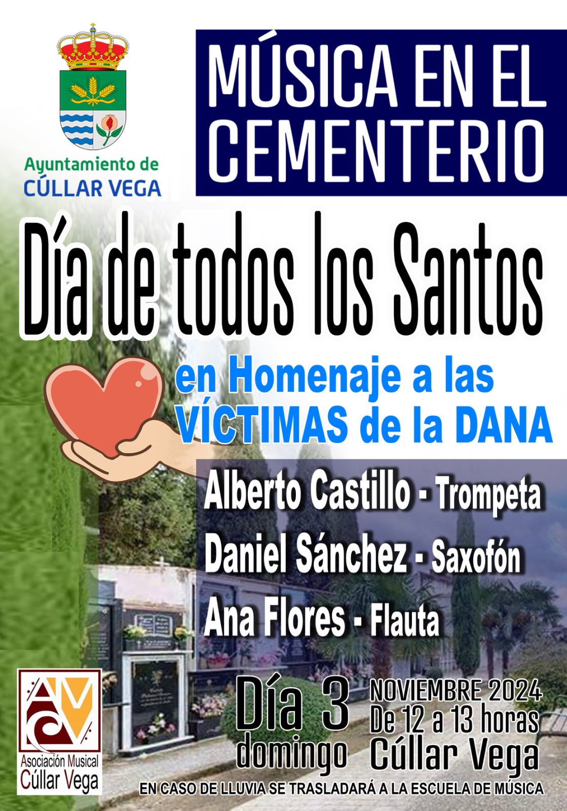 El domingo 3 de noviembre, como homenaje a las Víctimas de la DANA y por la festividad de Todos los Santos, el Cementerio de Cúllar Vega acogerá un concierto de música clásica que tendrá lugar entre las 12:00 y las 13:00 horas, con un repertorio especialmente seleccionado para la ocasión. Actuarán tres músicos de la Asociación Musical Cúllar Vega: Alberto