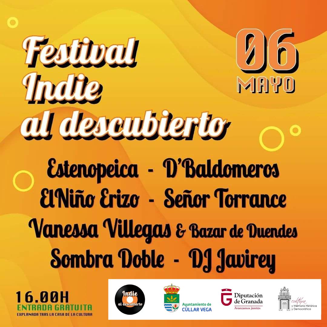 El próximo sábado 6 de mayo en la explanada de la Casa de la Cultura, comenzará a las 16:00 h. el PRIMER FESTIVAL de música ‘INDIE AL DESCUBIERTO‘ con entrada gratuita y con la participación de bandas de Granada, Málaga y Jaén: Estenopeica, D’Baldomeros, El Niño Erizo, Señor Torrance, Vanessa Villegas & Bazar de Duendes, Sombra Doble y Dj Javirey.