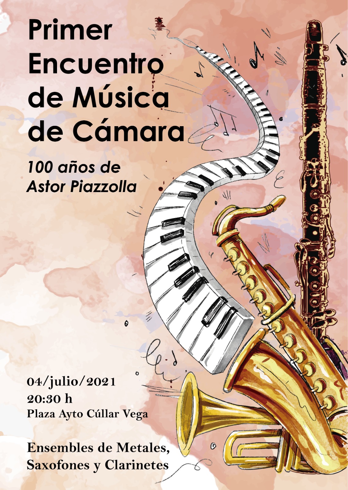 El domingo 4 de Julio a las 20:30 h en la Plaza del Ayuntamiento de Cúllar Vega tendrá lugar el Primer Encuentro de Música de Cámara «100 años de Astor Piazzolla» con las actuaciones de las Ensembles de Metales, Saxofones y Clarinetes de la Asociación Musical de Cúllar Vega. – Día: 04 de julio de 2021 – Hora: 20:30h. –