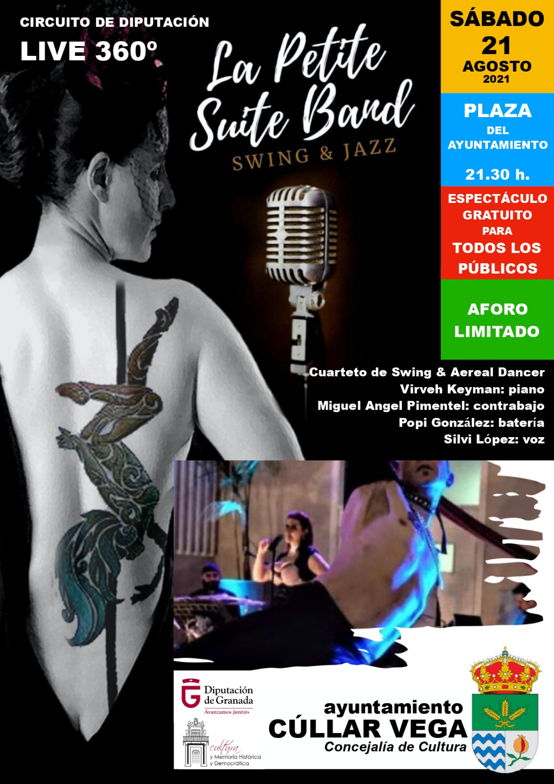 Actuación de La Petite Suite Band + Aereal Dancer dentro del Programa Live 360º de la Diputación de Granada con Virveh Keyman al piano, Miguel Ángel Pimentel al contrabajo, Popi González a la batería y la voz de Silvi López. Un viaje por aire, tierra y mar en la América de los años 20, un recorrido por la fusión de