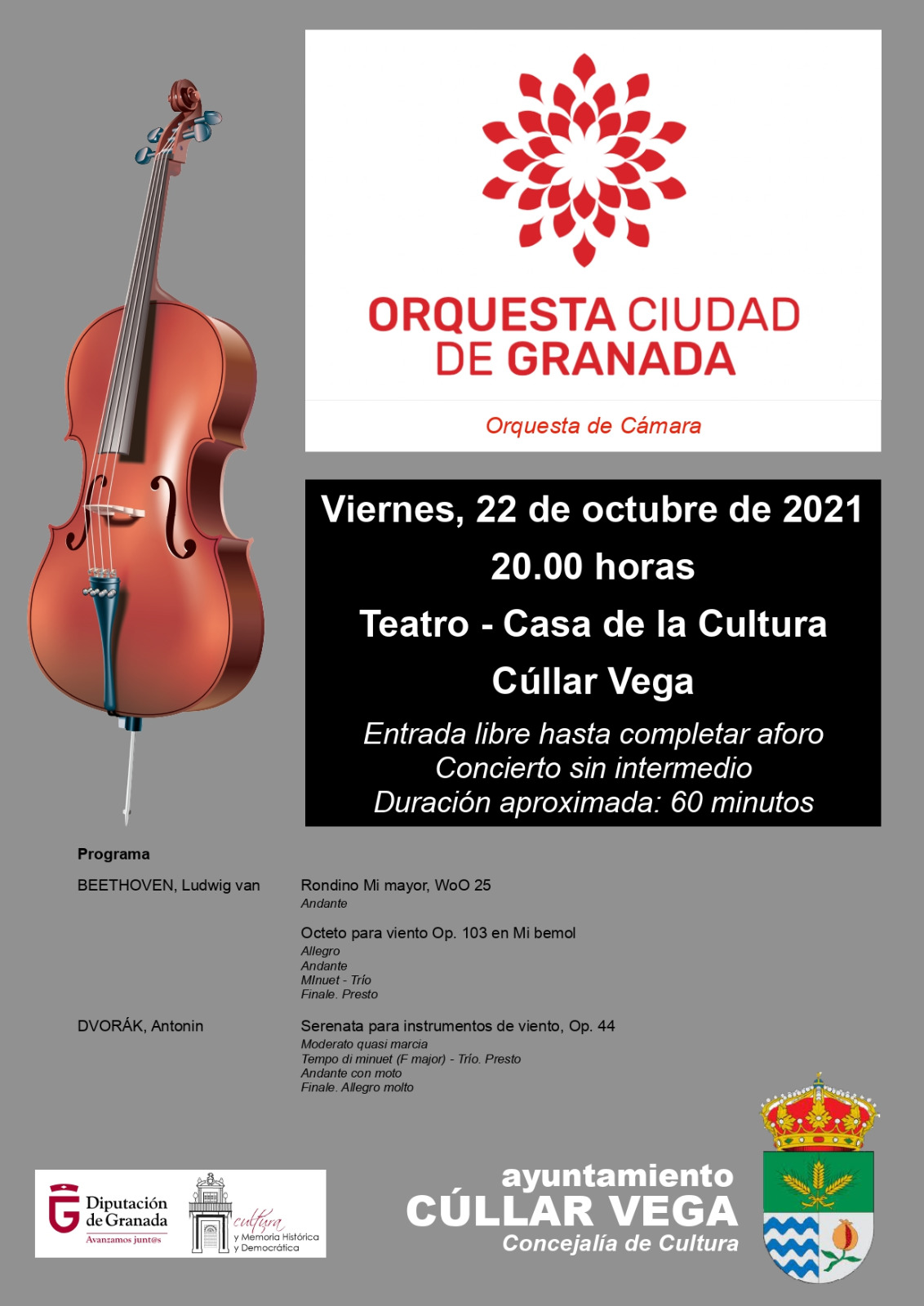 Será el próximo viernes día 22 de Octubre a las 20:00 horas en el Teatro de la Casa de la Cultura de Cúllar Vega Entrada libre hasta completar el aforo Concierto sin intermedio y de 60 minutos de duración aproximadamente.
