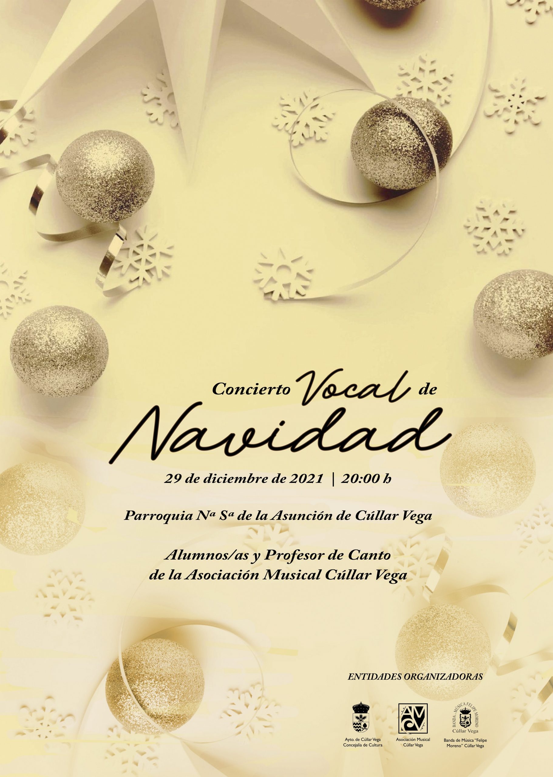 El próximo 29 de diciembre de 2021 a las 20:00 h tendrá lugar un CONCIERTO VOCAL DE NAVIDAD con la interpretación de música sacra por parte del alumnado y profesor de Canto de la Asociación Musical Cúllar Vega. Recuerda: – Día: 29 de diciembre de 2021 – Hora: 20:00h. – Lugar: Parroquia Ntra. Sª de la Asunción de Cúllar Vega
