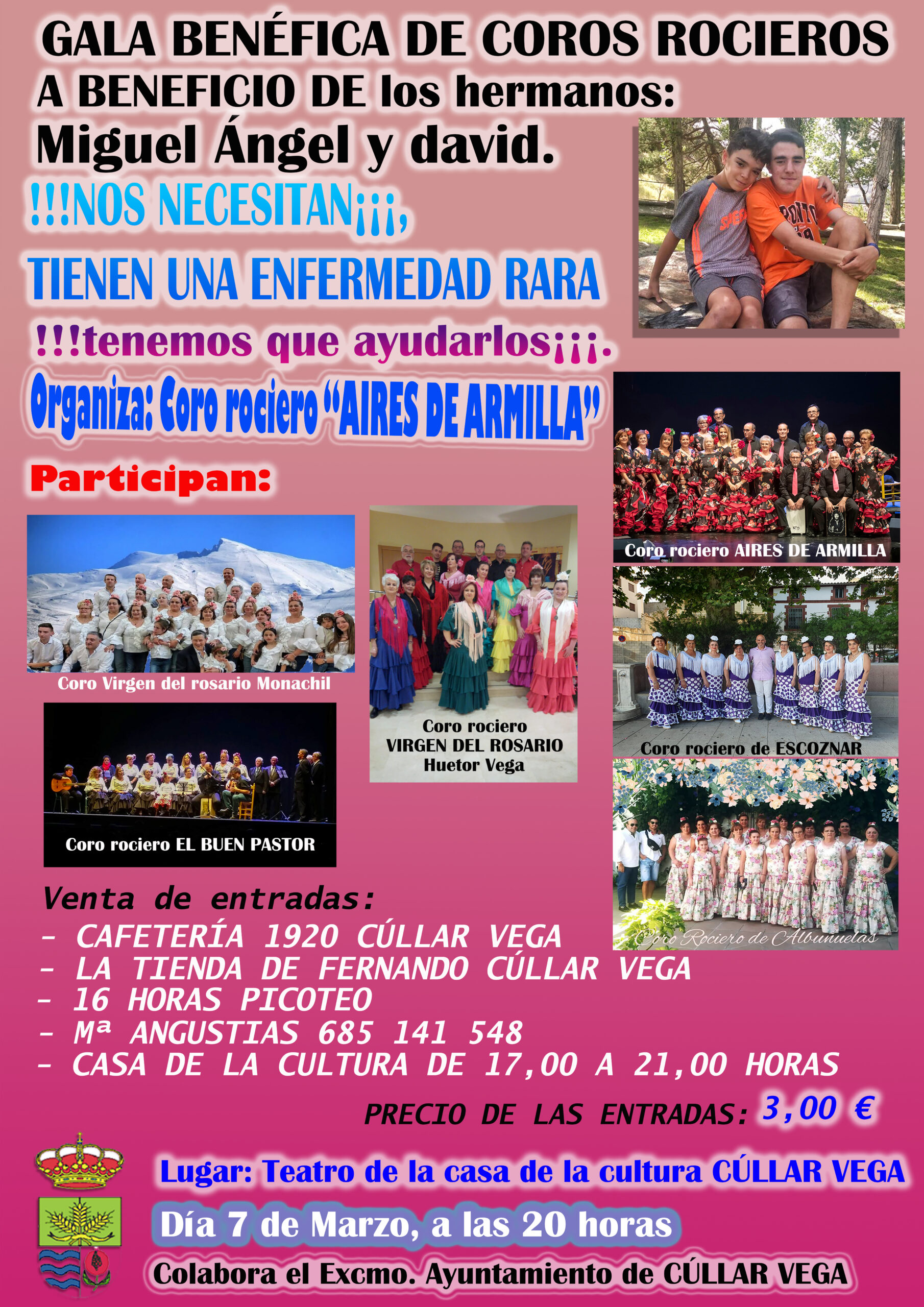 El 7 de Marzo a las 20:00 h podremos disfrutar y a la vez ayudar en esta magnífica Gala Benéfica organizada por el Coro Rociero Aires de Armilla y con la participación del Coro Rociero Virgen del Rosario de Monachil, Coro Rociero Virgen del Rosario de Huétor Vega, Coro Rociero de Albuñuelas, Coro Rociero de Escóznar y el Coro Rociero