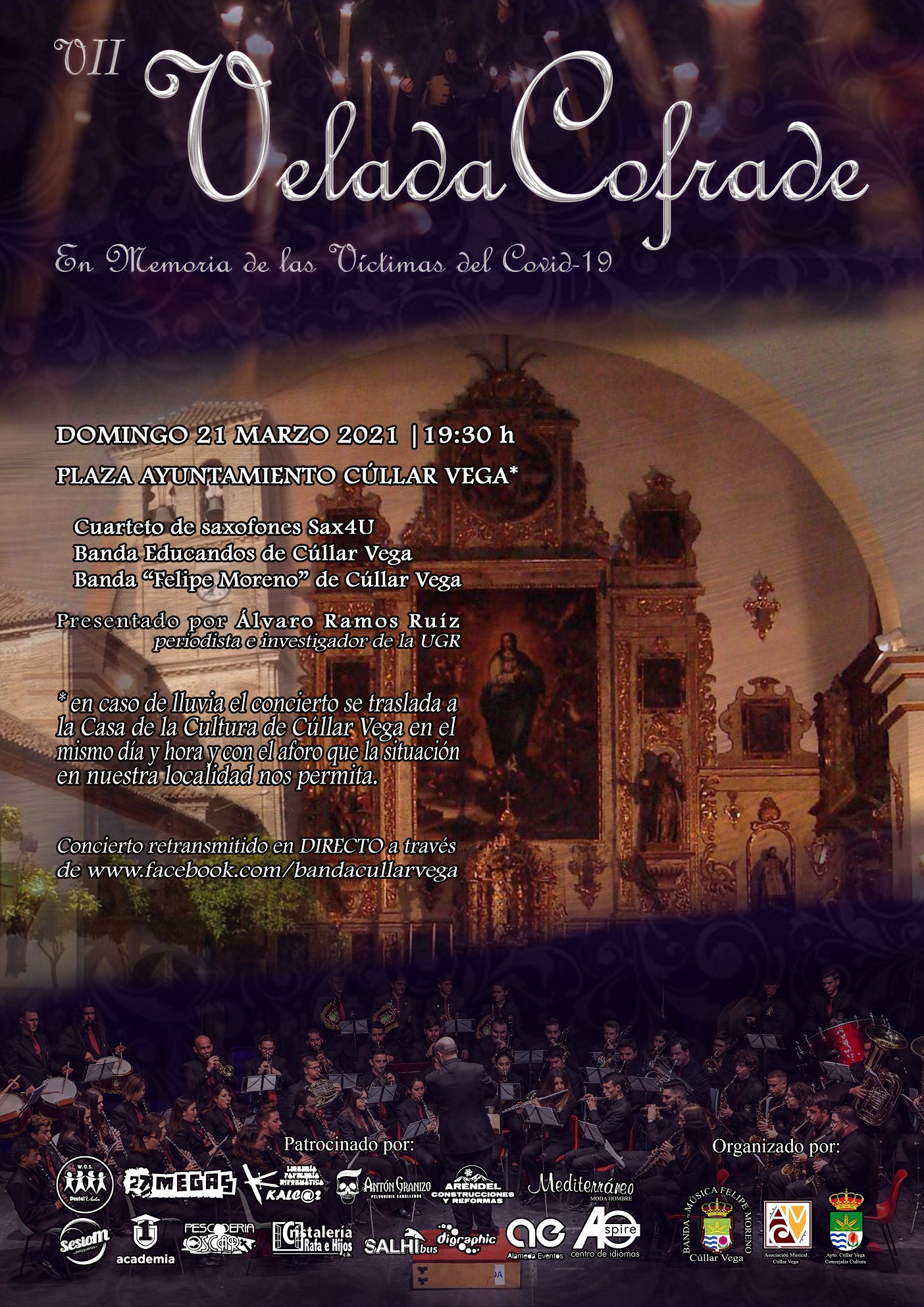 La Asociación Musical de Cúllar Vega prepara para este domingo 21 de Marzo la Séptima Edición de la Velada Cofrade de Cúllar Vega. Esta edición se celebrará en memoria de las Víctimas del Covi-19 y tendrá lugar al aire libre en la Plaza del Ayuntamiento de Cúllar Vega del domingo 21 de marzo a las 19:30 h; el concierto contará