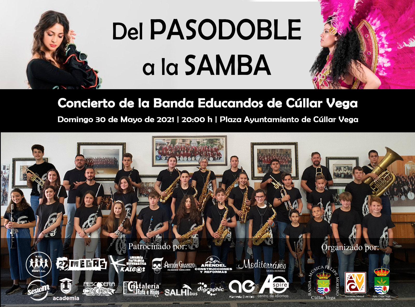 El próximo Domingo 30 de mayo a las 20:00 h y en la Plaza del Ayuntamiento de Cúllar Vega podremos disfrutar de un concierto al aire libre a cargo de la Banda Educandos de Cúllar Vega en la que nos deleitará con pasodobles y samba. El concierto está organizado por la Concejalía de Cultura del Ayuntamiento de Cúllar Vega y