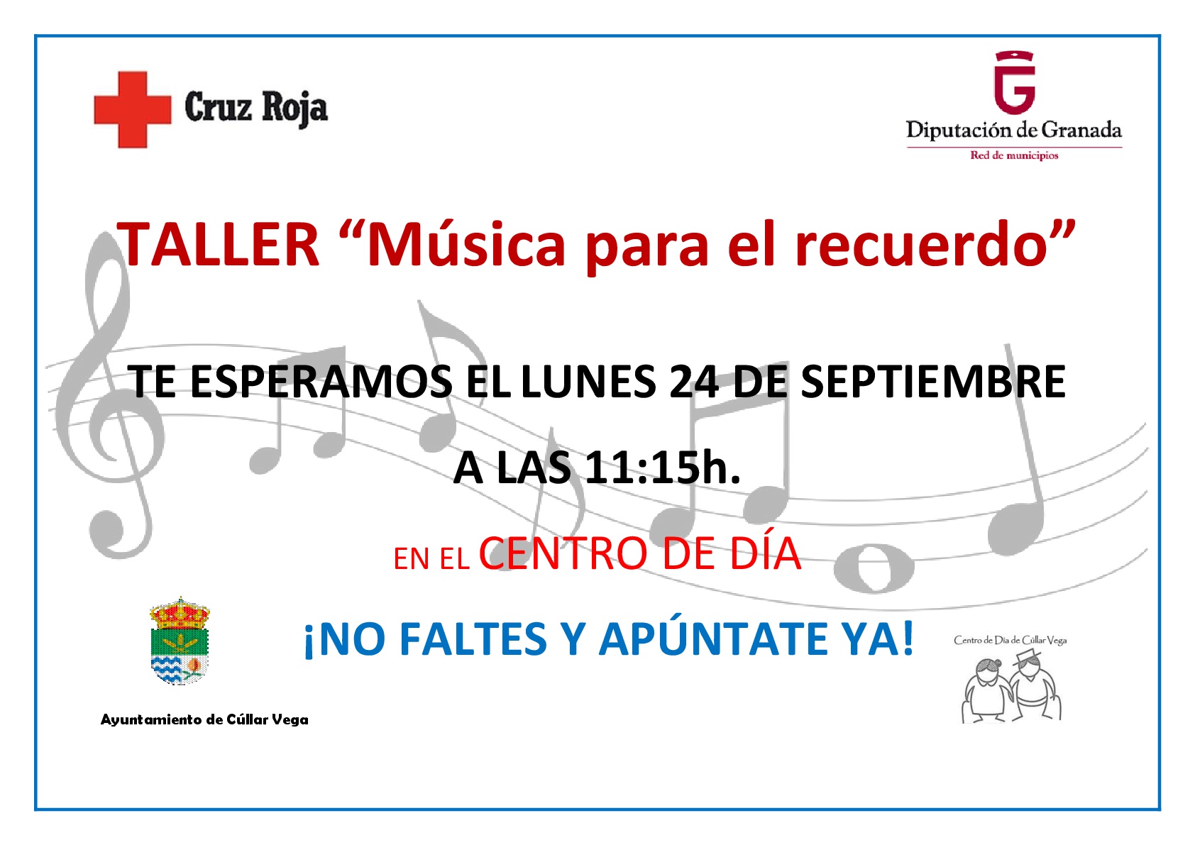 El lunes 24 de Septiembre a las 11:45 h os esperamos en el Centro de Día para un extraordinario Taller de «MÚSICA PARA EL RECUERDO« !NO FALTES Y APÚNTATE YA¡