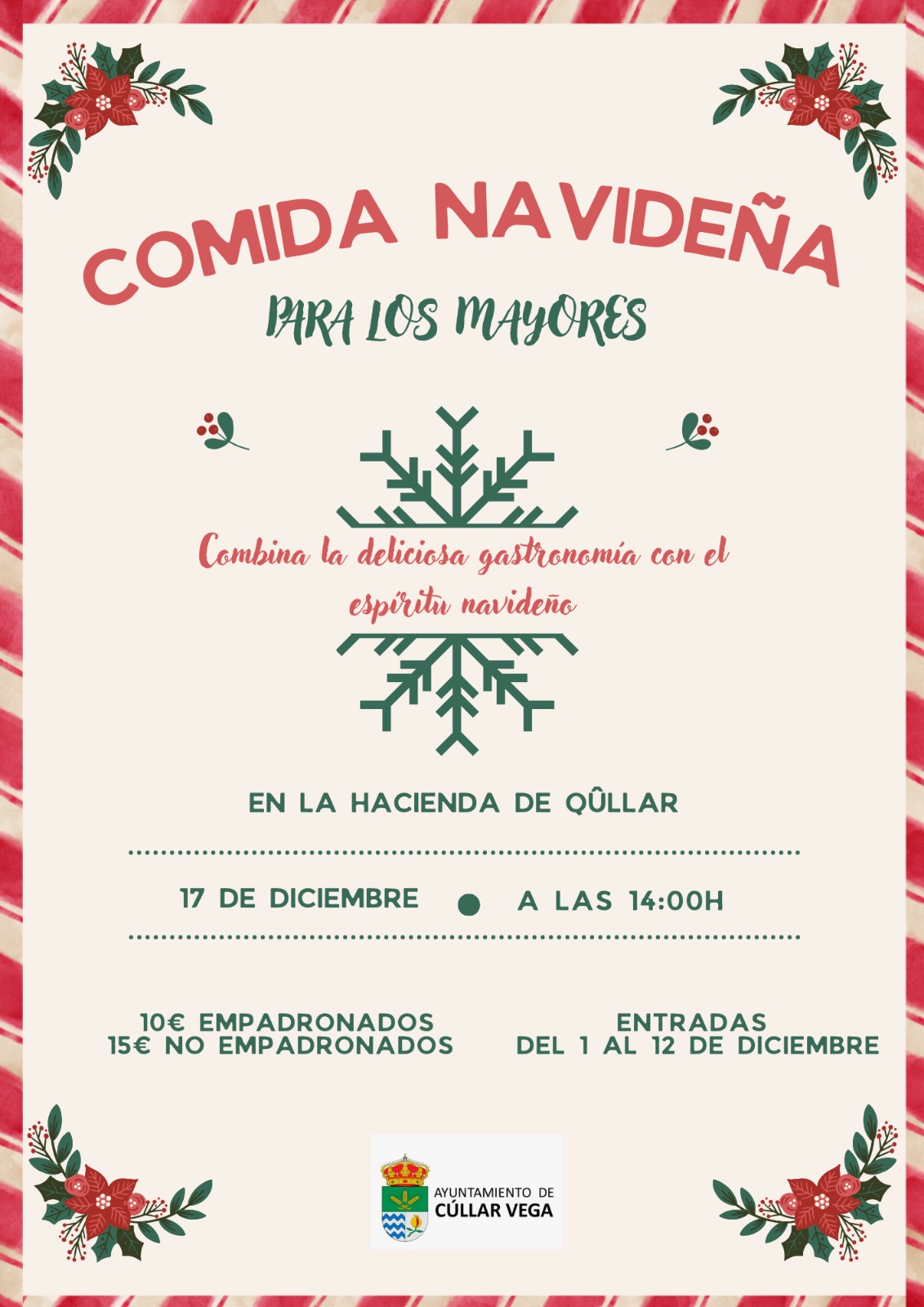 El próximo 17 de diciembre se celebrará la tradicional Comida Navideña para las personas mayores, un encuentro pensado para disfrutar de un ambiente festivo y de convivencia en fechas tan especiales. La actividad tendrá lugar a las 14:00 horas en La Hacienda de Qûllar. A partir del lunes 1 y hasta el 12 de diciembre, podéis adquirir vuestras entradas en