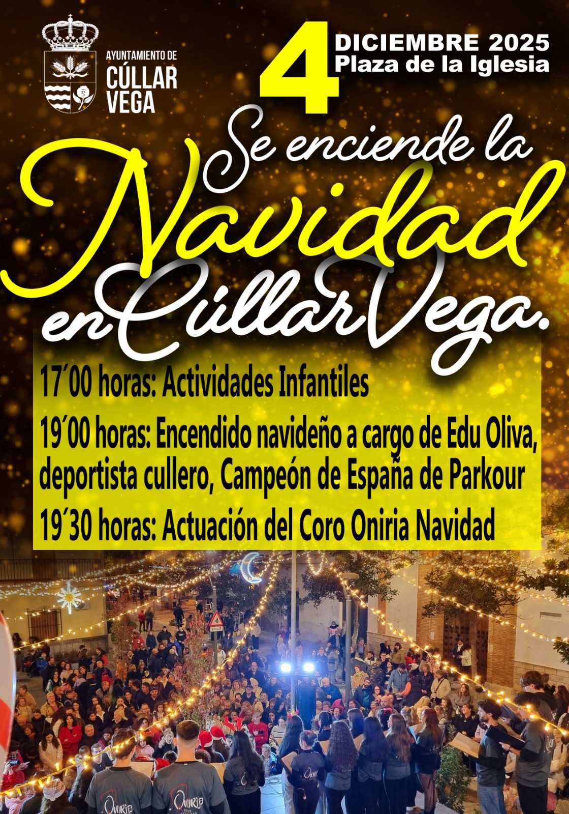 La Plaza de la Iglesia será este 4 de diciembre el escenario del tradicional encendido navideño de Cúllar Vega, un acto que marca el inicio oficial de la temporada festiva en el municipio. La jornada comenzará a las 17:00 horas con actividades infantiles, pensadas para que los más pequeños disfruten de una tarde llena de juegos y ambiente navideño. El
