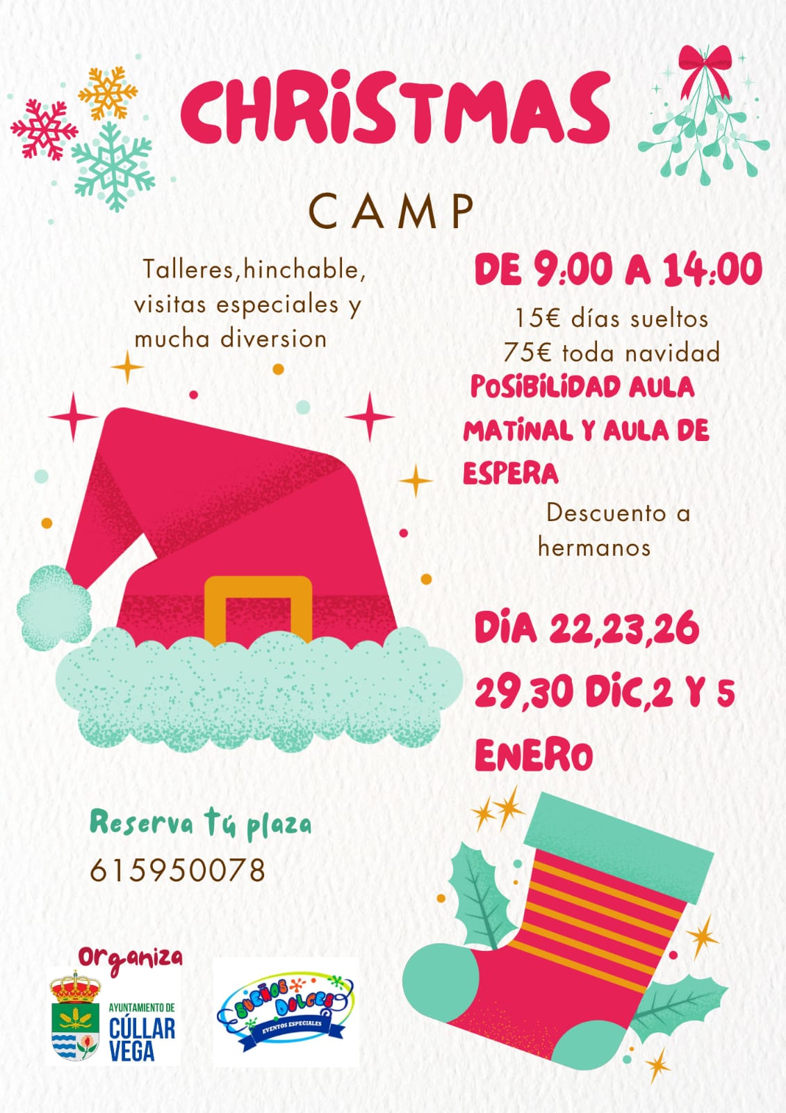 Descarga la programación completa en https://www.cullarvega.com/wp-content/uploads/2025/12/programacion-navidad-2025-2026-cullar-vega.pdf CHRISTMAS CAMP: Talleres, hinchables, visitas especiales y mucha diversión. Reserva tu plaza llamando al 615950078. De 9:00 a 14:00 horas. 15€ días sueltos. 75€ toda la navidad. Posibilidad de Aula Matinal y Aula de Espera. Descuento a hermanos. Días: 22, 23, 26, 29, 30 de Diciembre, 2 y 5 de Enero. DICIEMBRE 2025 XIV