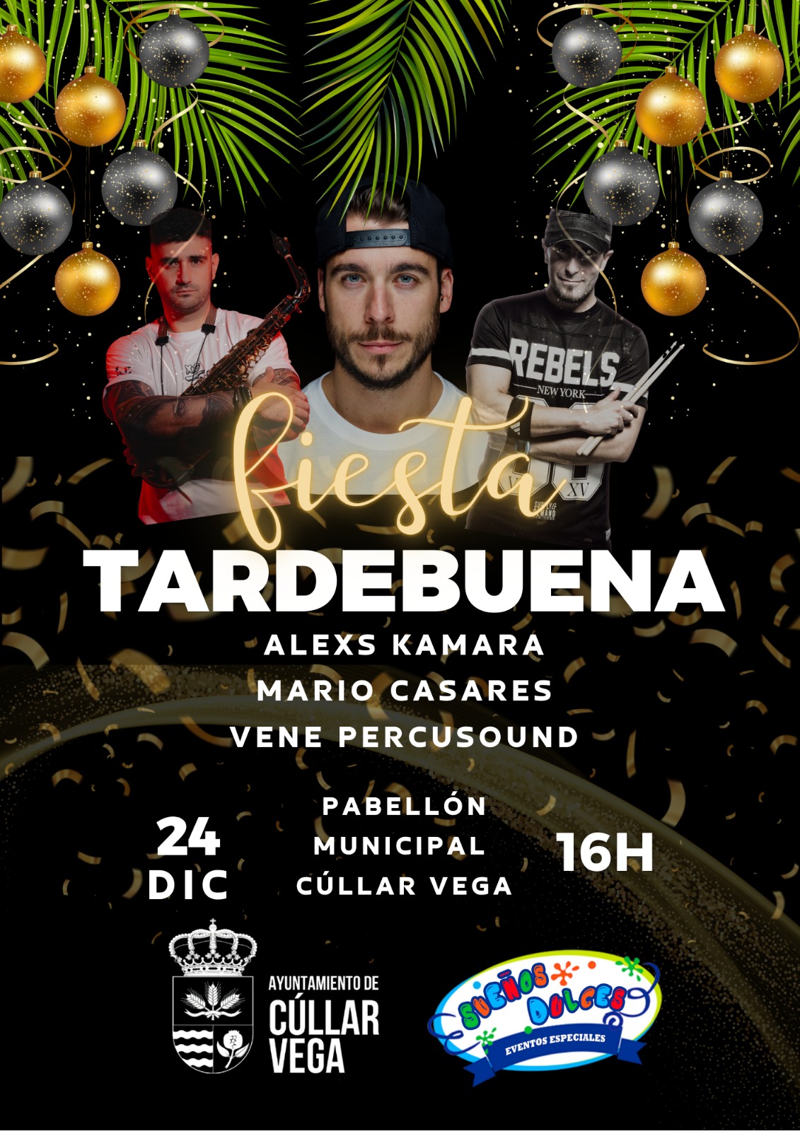 El Ayuntamiento de Cúllar Vega ha organizado para este 24 de diciembre, a partir de las 16:00 horas, Tardebuena, que tendrá lugar en el Pabellón Municipal y que promete reunir a vecinos y visitantes en una tarde llena de música, ambiente navideño y diversión. El cartel está encabezado por Alexs Kamara, contará además con las actuaciones de Mario Casares y