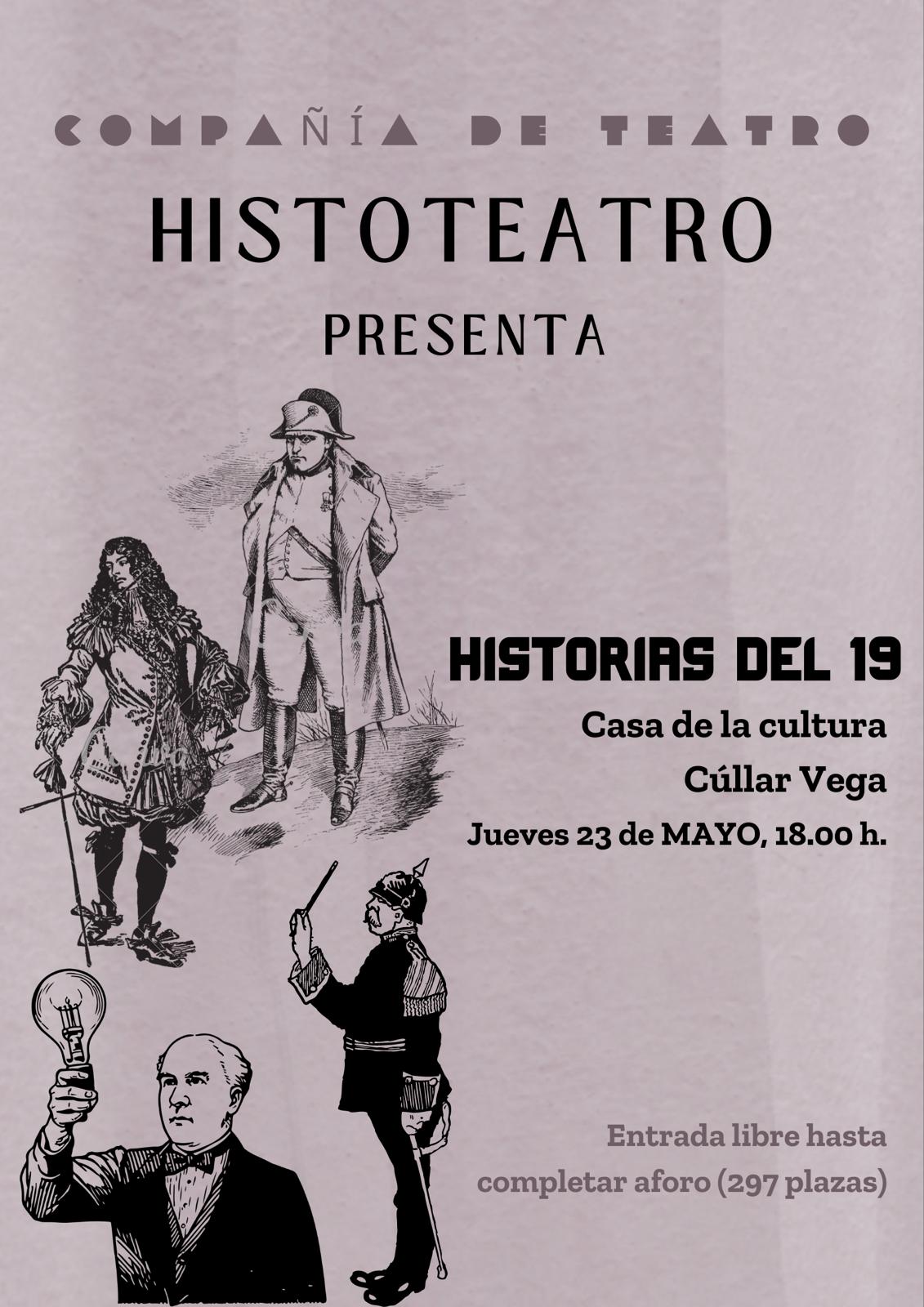 La compañía de Teatro HistoTeatro presenta «HISTORIAS DEL 19» este jueves 23 de mayo, a las 18 h. en la Casa de la Cultura de Cúllar Vega e interpretado por alumnado el IES Arabuleila. Entrada libre hasta completar aforo (297 plazas)