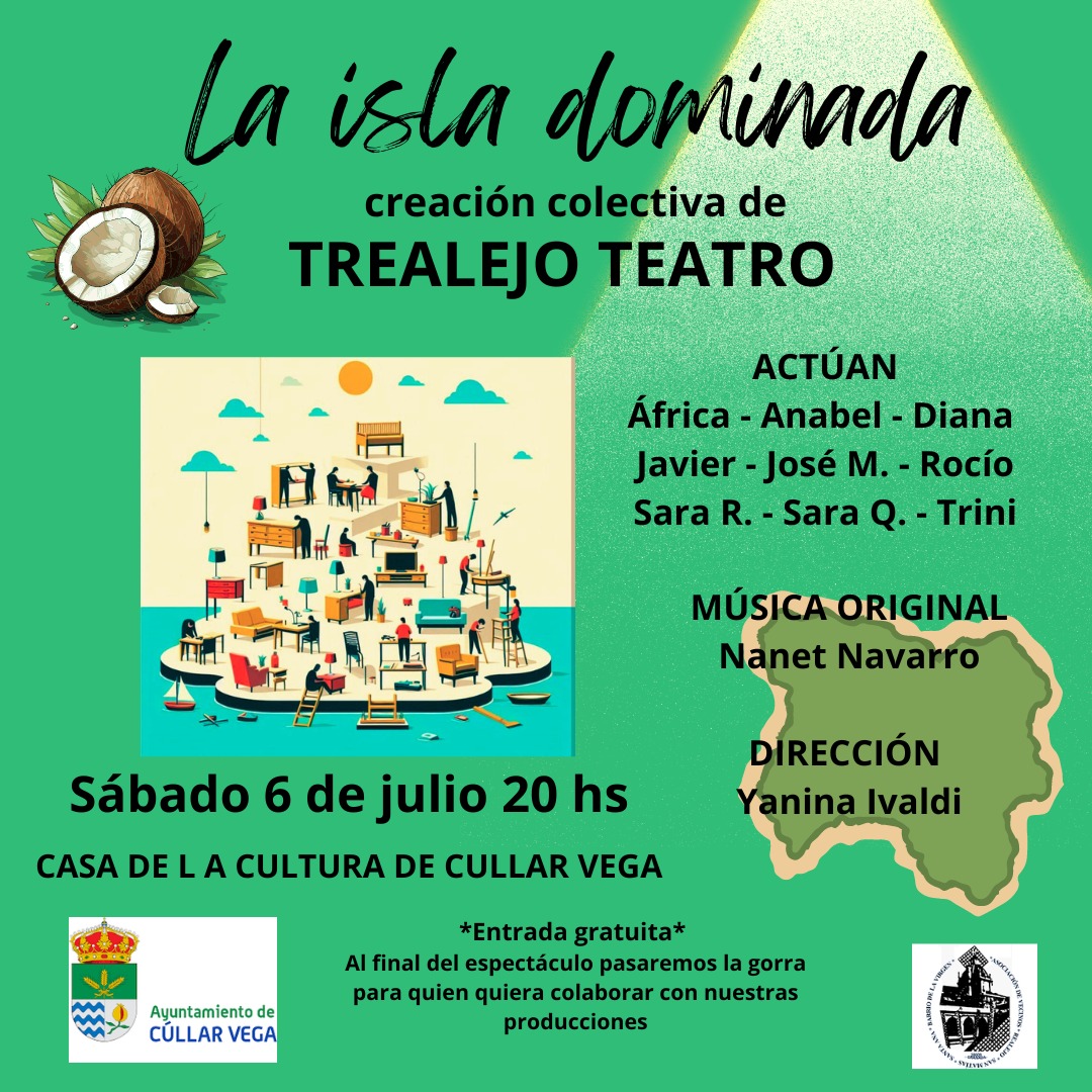 Ven y disfruta con «LA ISLA DOMINADA» el próximo sábado 6 de julio en el teatro de la Casa de la Cultura, a las 20 h y con entrada gratuita. Actuarán África, Anabel, Diana, Javier, José M., Rocío, Sara Q, Sara R. y Trini de Trealejo Teatro bajo la dirección de Yanina Ivaldi y con música original de de Nanet