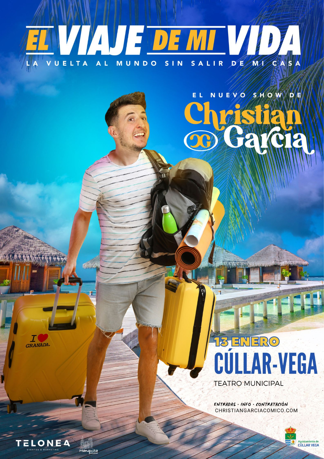 Vuelve Christian García a Cúllar Vega con su nuevo espectáculo «El viaje de mi vida«, donde disfrutarás de un monólogo hilarante que te llevará a dar la vuelta al mundo sin salir de casa. Tendrá lugar el sábado 13 de enero de 2024 a las 19:00 h en el Teatro de la Casa de la Cultura de Cúllar Vega Venta