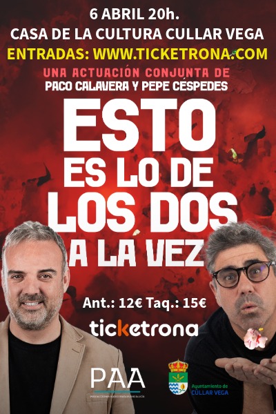 El sábado 6 de abril pasa un rato divertido con el nuevo show de Paco Calavera y Pepe Céspedes, «Esto es lo de los dos a la vez» , a las 20 h en el Teatro de la Casa de la Cultura. Ya a la venta las entradas en https://ticketrona.com/evento/esto-es-lo-de-los-dos-a-la-vez-en-cullar-vega