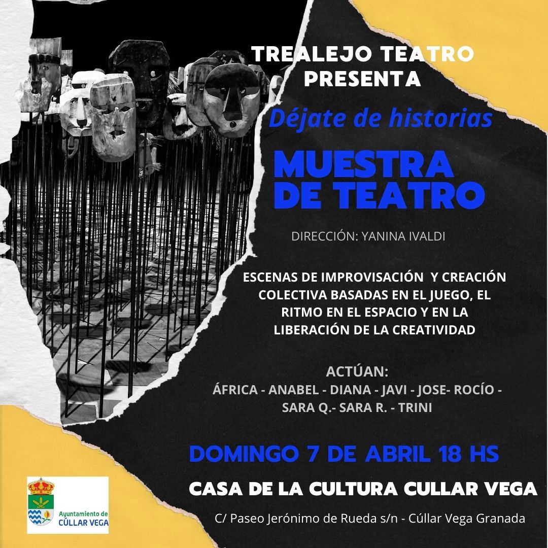Ven y disfruta con escenas de improvisación y creación colectiva en el juego, el ritmo en el espacio y en la liberación de la creatividad el próximo domingo 7 de abril con «DÉJATE DE HISTORIAS». Actuarán África, Anabel, Diana, Javi, José, Rocío, Sara Q, Sara R. y Trini de Trealejo Teatro bajo la dirección de Yanina Ivaldi Día: domingo 7