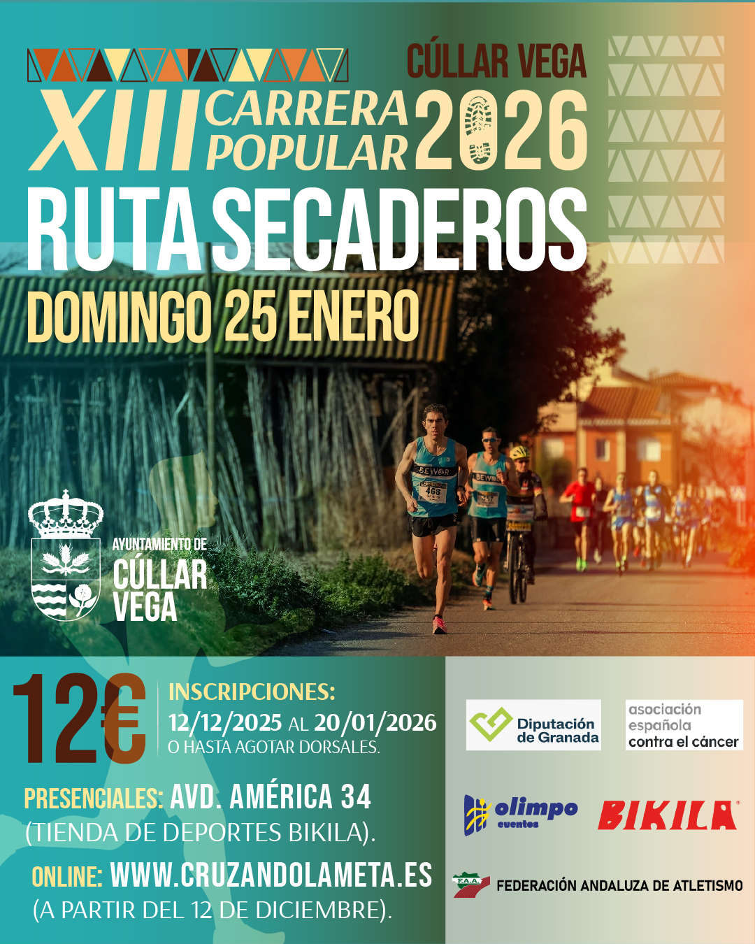 Cúllar Vega volverá a convertirse en punto de encuentro para el atletismo popular con la celebración de la XIII Carrera Popular Ruta Secaderos, que tendrá lugar el domingo 25 de enero de 2026. Una cita deportiva ya consolidada en el municipio, que cada año reúne a corredores de distintas edades y niveles para disfrutar de un recorrido emblemático entre paisajes