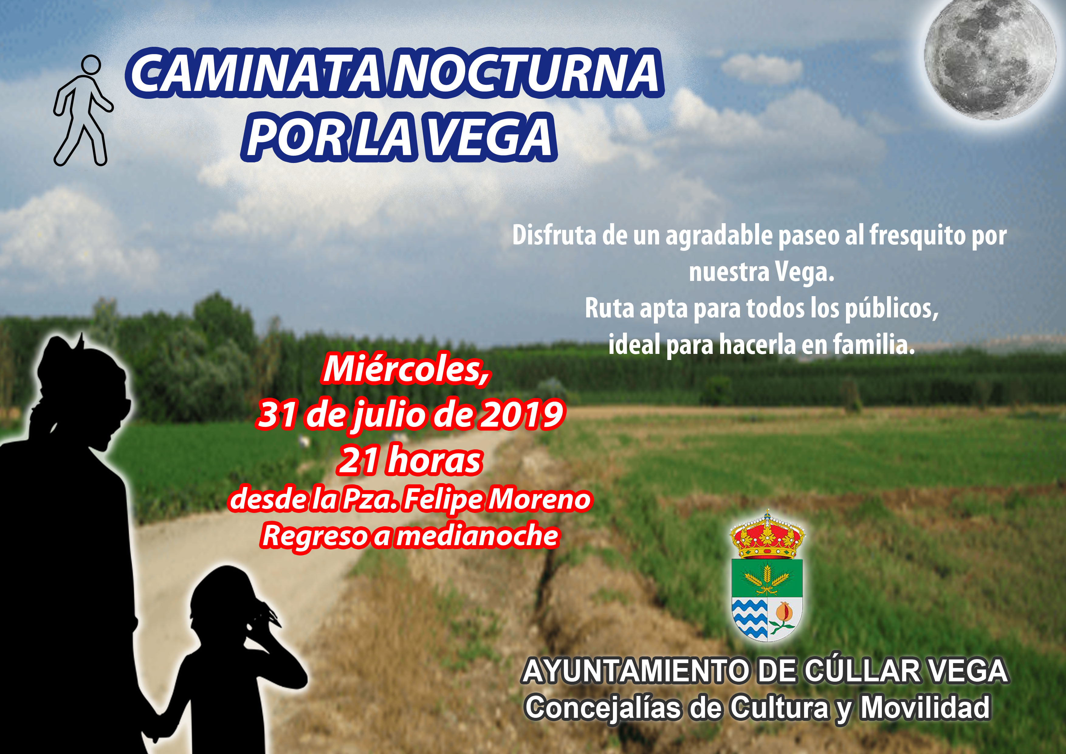 Caminata Nocturna por la Vega Disfruta del entorno de nuestra vega con un agradable paseo ideal para hacerlo en familia. Ruta apta para todos los públicos Salida: Miércoles día 31 de Julio a las 21´00 horas desde la Plaza Felipe Moreno. Regreso aproximadamente sobre las 00´00 horas. No es necesario inscribirse, sólo presentarse el día de la cita en el