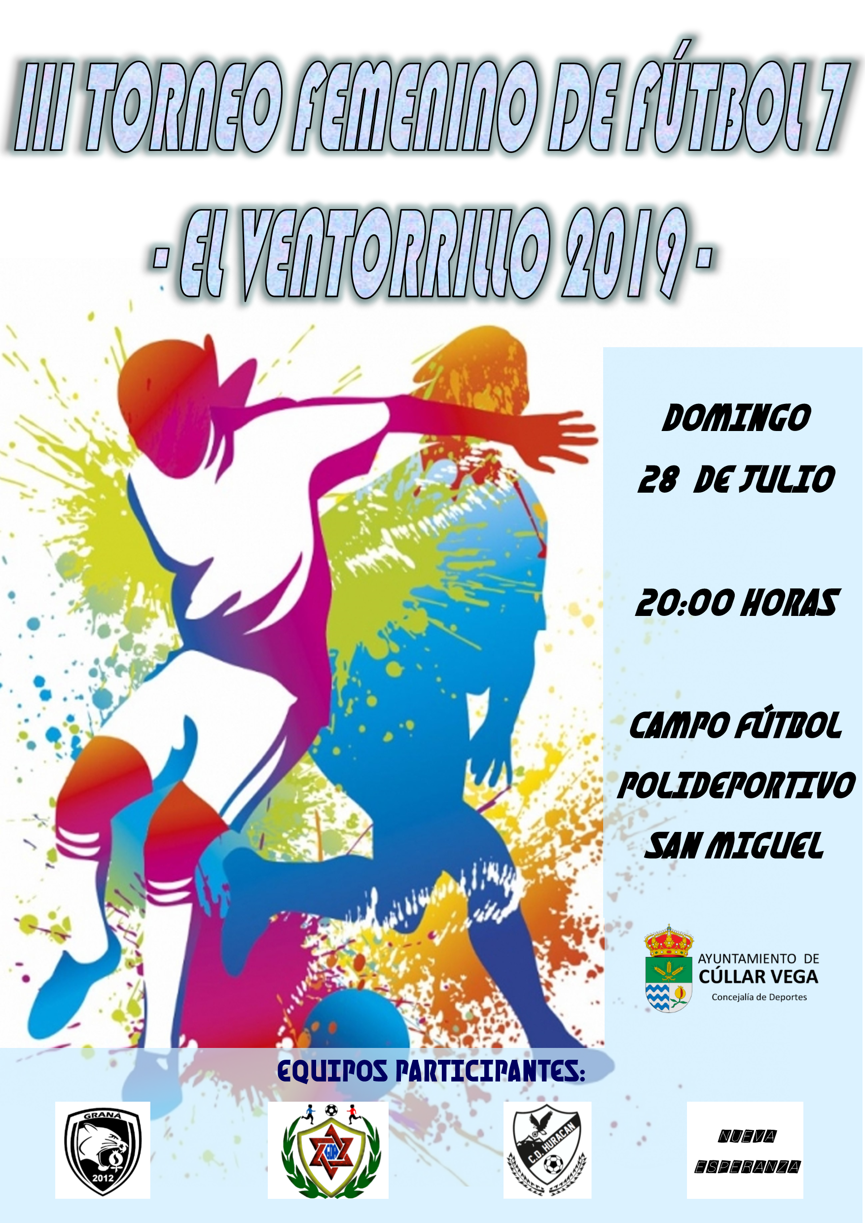 Desde las concejalías de Fiestas y Deportes se informa: El próximo domingo, 28 de julio, tendrá lugar en el Polideportivo Municipal San Miguel el «III Torneo de Fútbol 7 femenino -El Ventorrillo 2019-”. A partir de las 20:00h se darán cita cuatro de los mejores equipos de fútbol femenino de nuestra provincia. ¡Te esperamos! Organiza: Concejalías de fiestas y deportes