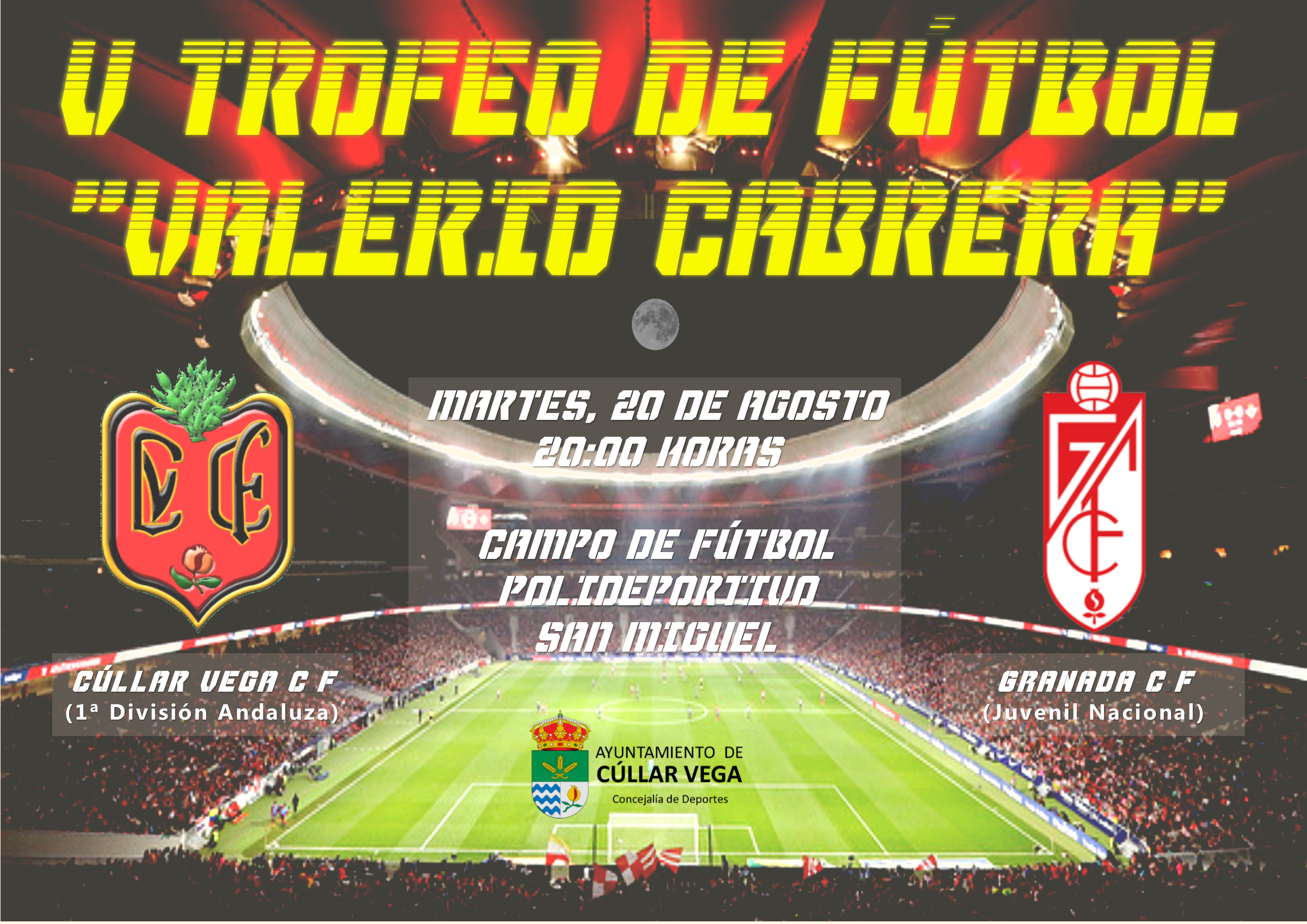 Desde la Concejalía de Deportes se informa: El próximo martes, 20 de Agosto, se disputará la V Edición del Trofeo de Fútbol “Valerio Cabrera” en el Polideportivo Municipal San Miguel de Cúllar Vega a partir de las 21h donde tendrá lugar la presentación del Cúllar Vega C.F. para la temporada 2019-2020. En esta ocasión el club invitado será el equipo de