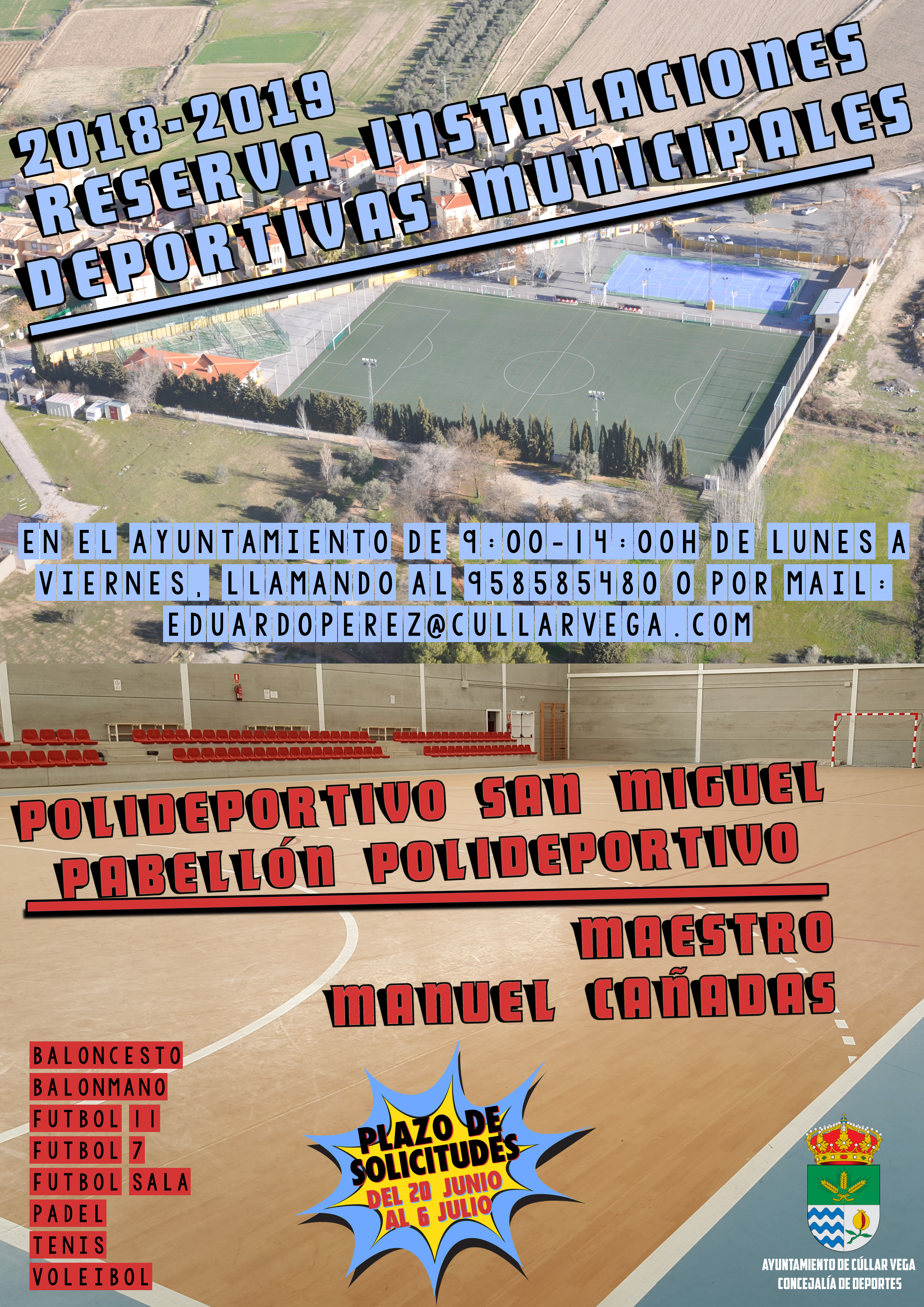 La Concejalía de Deportes informa: Desde el próximo 20 de junio, quedará abierto el plazo para la presentación de las solicitudes de reserva de instalaciones deportivas municipales para la temporada 2018-2019. Las solicitudes se podrán presentar en el Ayuntamiento de Cúllar Vega de lunes a viernes en horario de 9h a 14h o en el correo: eduardoperez@cullarvega.com, desde el 20 de