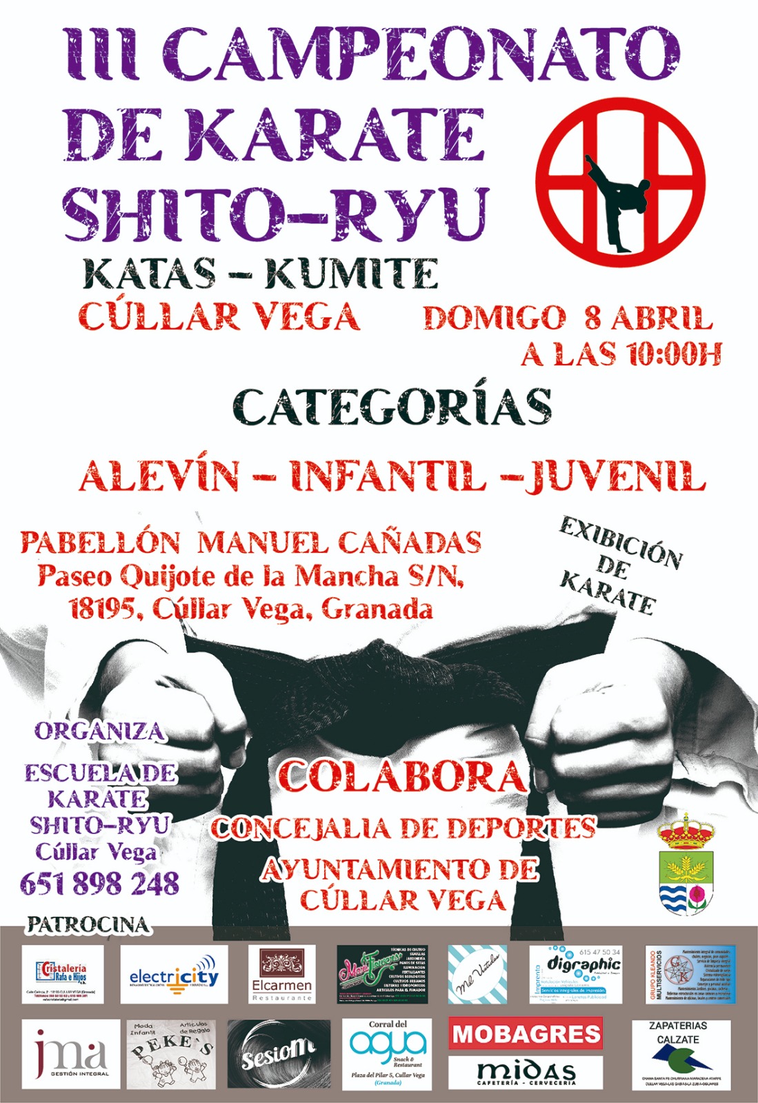 Desde la concejalía de Deportes se informa: Por tercer año consecutivo, la Escuela de Karate Shito-Ryu Cúllar Vega organiza junto con la Concejalía de Deportes el III Campeonato de Karate Shito-Ryu (katas-kumite) que se celebrará en el Pabellón Municipal Maestro Manuel Cañadas el domingo, 8 de abril, a partir de las 10h. En el campeonato participarán además del club del