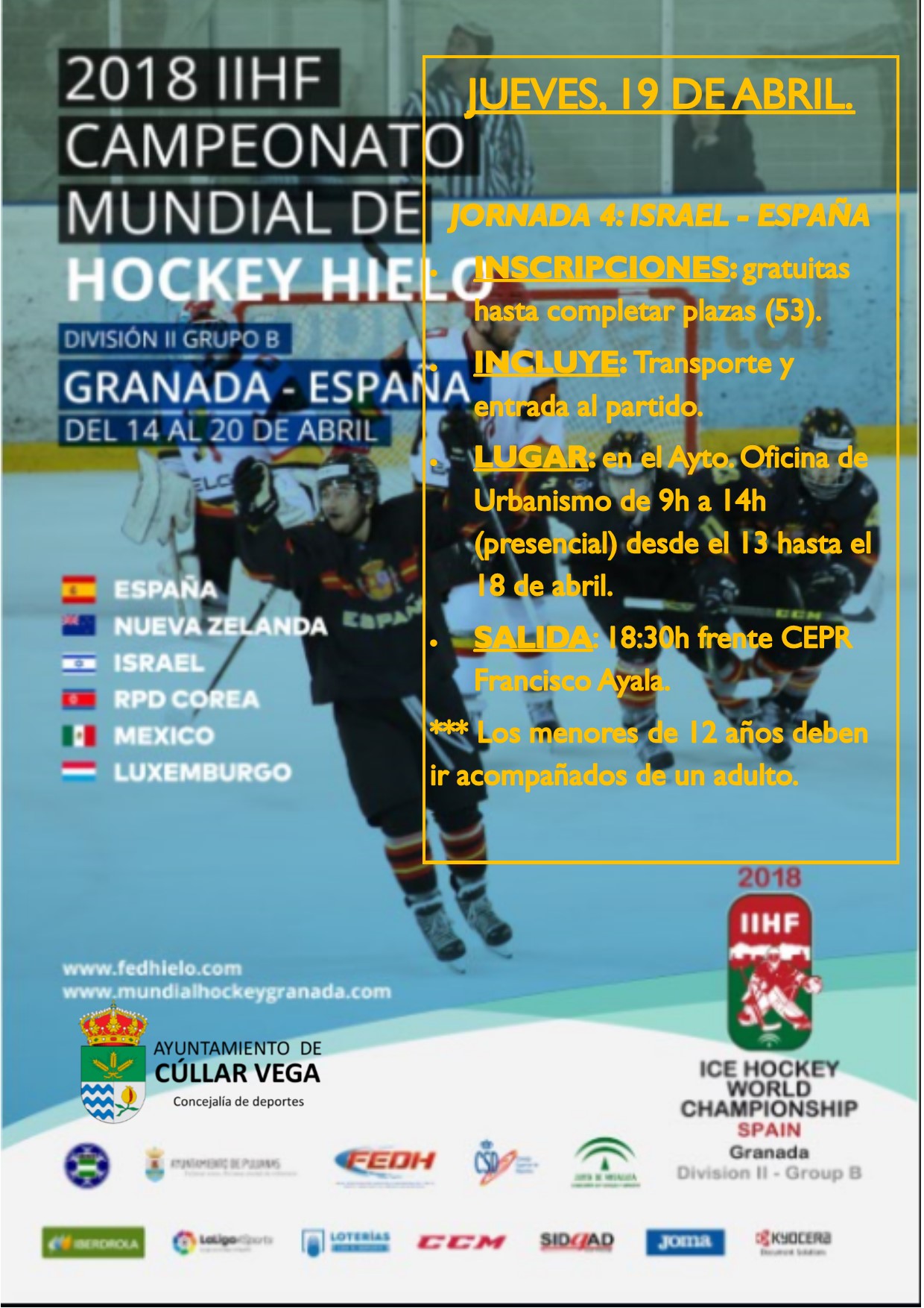 Desde la Concejalía de Deportes se informa: Con motivo de la celebración del «2018 IIHF Campeonato Mundial de Hockey Hielo» que se está celebrando en Granada desde el pasado 14 de abril en las instalaciones de Igloo Granada – Pulianas, organizamos esta salida dirigida a todas las personas que quieran presenciar un partido al más alto nivel de esta modalidad