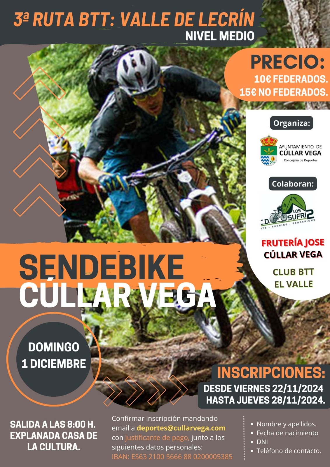 Salida: domingo 1 de diciembre de 2024 a las 8’00 horas desde la Explanada Casa de la Cultura. Precio: 10€ Federados / 15€ No Federados Inscripciones: Del viernes 22 al jueves 28 de noviembre de 2024 enviando un email a deportes@cullarvega.com junto a justificante de pago y los siguientes datos personales: nombre y apellidos, fecha de nacimiento, DNI y teléfono