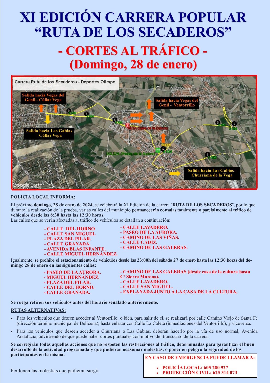 La Policía Local INFORMA: El próximo día 28 de enero de 2024 se celebra la undécima edición de la carrera ¨RUTA DE LOS SECADEROS – DEPORTES OLIMPO¨, por lo que durante la realización de la prueba varias calles del municipio permanecerán cortadas totalmente o parcialmente al tráfico de vehículos desde las 8:30 hasta las 12:30 horas aproximadamente. Las calles que