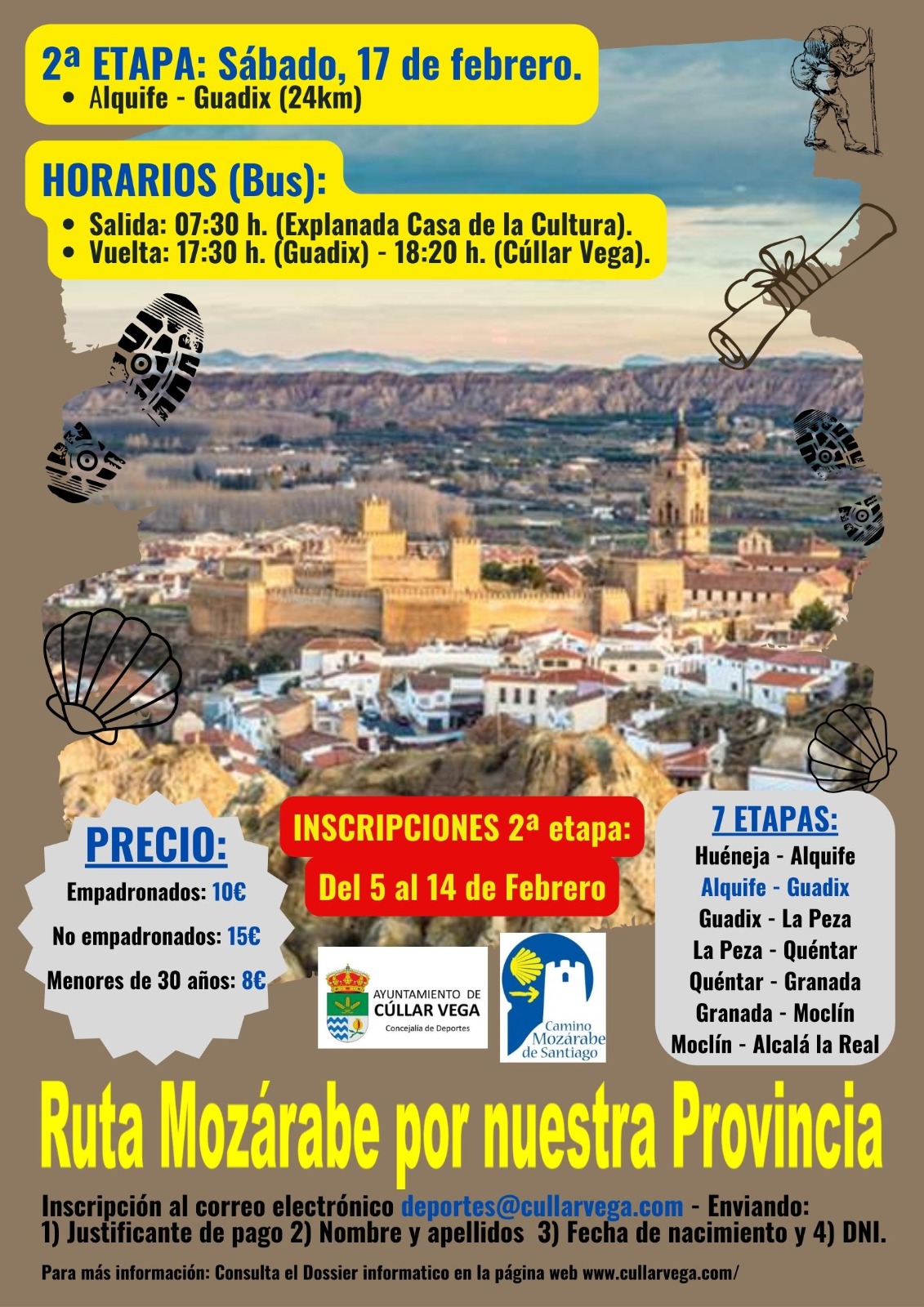 2ª etapa Ruta Mozárabe «Alquife – Guadix » (24 km) – Fecha: Sábado 17 de febrero de 2024 – Horarios (bus): salida 07:30 h. (explanada Casa de la Cultura) | vuelta 17:30 h. (Guadix) – 18:20 h. (Cúllar Vega) – Inscripciones: Las inscripciones se realizarán enviando nombre completo, DNI, fecha de nacimiento y número de teléfono al correo deportes@cullarvega.com del 5