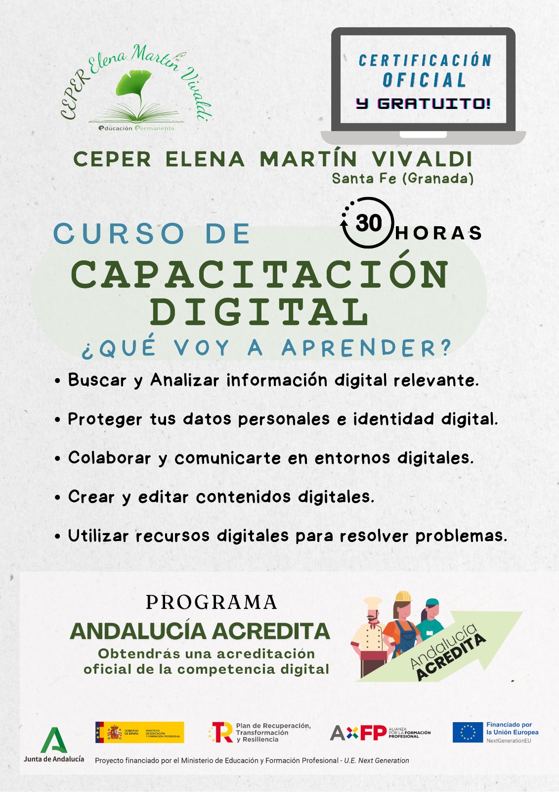 A través del CEPER Elena Martín Vivaldi se va a organizar un curso de Capacitación Digital con certificación oficial y gratuito en julio en horario de mañanas, con una duración de 30 horas y con el siguiente contenido: – Buscar y analizar información digital relevante. – Proteger tus datos personales e identidad digital. – Colaborar y comunicarte en entornos digitales.