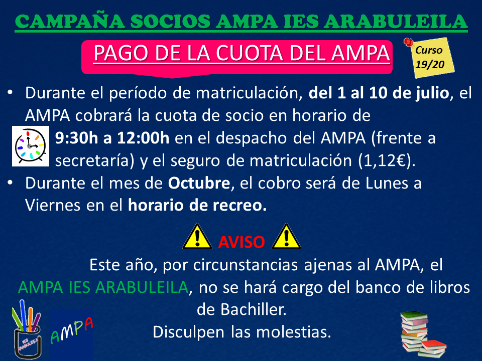 El Ampa del IES Arabuleila comienza con su campaña de soci@s para el curso 2019/2020. Durante el período de matriculación, que será del 1 al 10 de Julio, el Ampa cobrará la cuota de socio en horario de 9´30 a 12´00 horas en el despacho del Ampa (Frente a secretaría). Además se podrá pagar el seguro escolar que se solicita