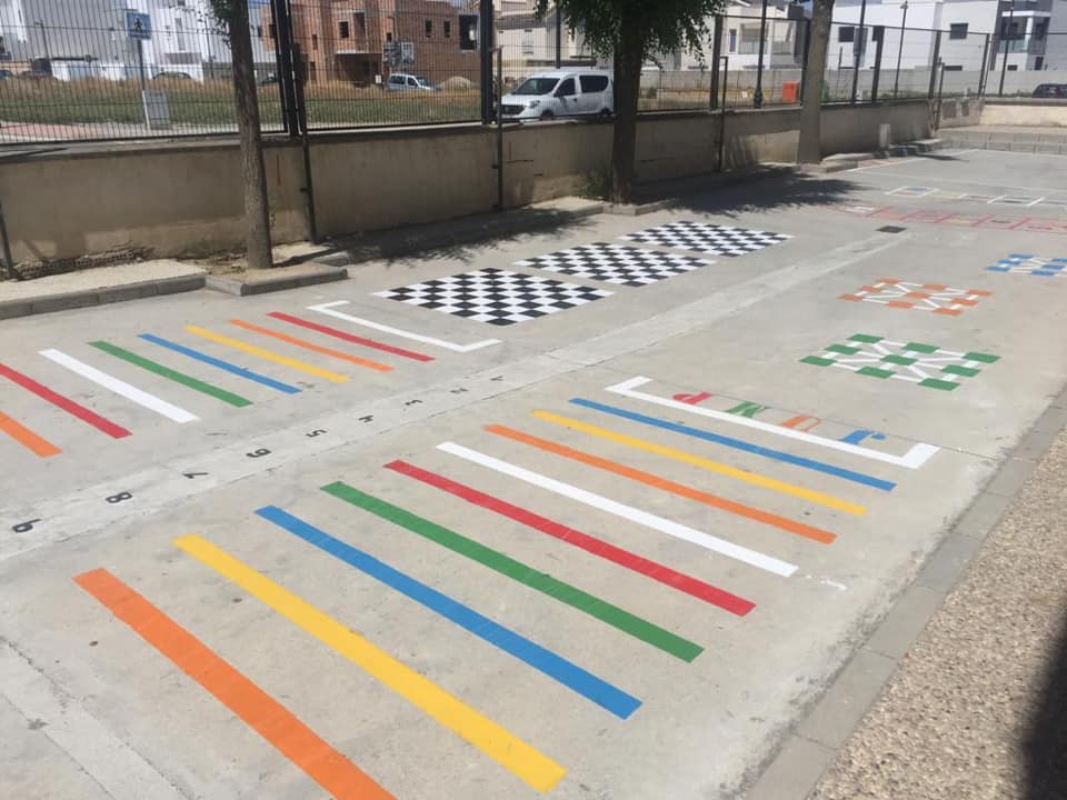 Padres y madres de las AMPAS San Miguel y Los Colorines pintan de colores los patios de los colegios La Viña y Francisco Ayala para que sus pequeños puedan jugar a la rayuela, el tres en raya o el Twister Los niños y niñas de los colegios de Cúllar Vega podrán jugar a juegos tradicionales, como la rayuela, el tres