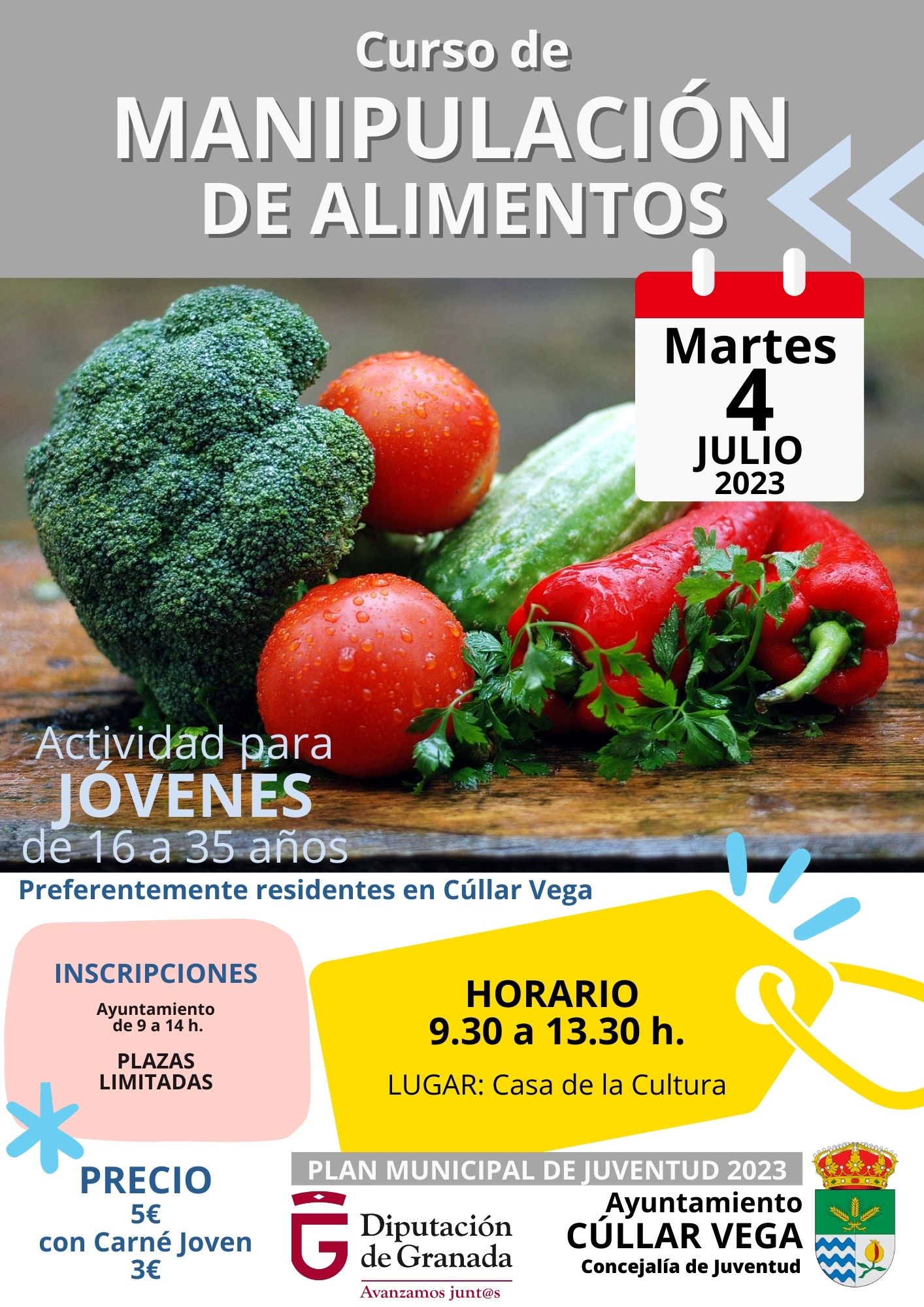 Actividad para jóvenes de 16 a 35 años preferentemente residentes en Cúllar Vega. Tendrá lugar en la Casa de la Cultura en horario de 09:30 a 13:30 h. el próximo martes 4 de julio. Inscripciones en el Ayuntamiento de 09 a 14 h. Plazas limitadas Precio: 5 € (con carné joven 3€)