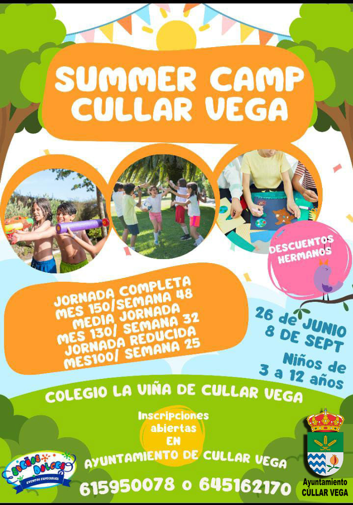 Dirigido a niños/as de 3 a 12 años, este año se desarrollará una escuela de verano en el colegio La Viña de Cúllar Vega del 26 de junio al 8 de septiembre. Inscripciones abiertas en el Ayuntamiento de Cúllar Vega. Teléfonos de información: 615 950 078 / 645 162 170 Descarga ficha de inscripción: https://www.cullarvega.com/wp-content/uploads/2023/06/FICHA-INSCRIPCION-CAMPAMENTO-DE-VERANO-SUENOS-DULCES.pdf PRECIOS: – Mes a jornada