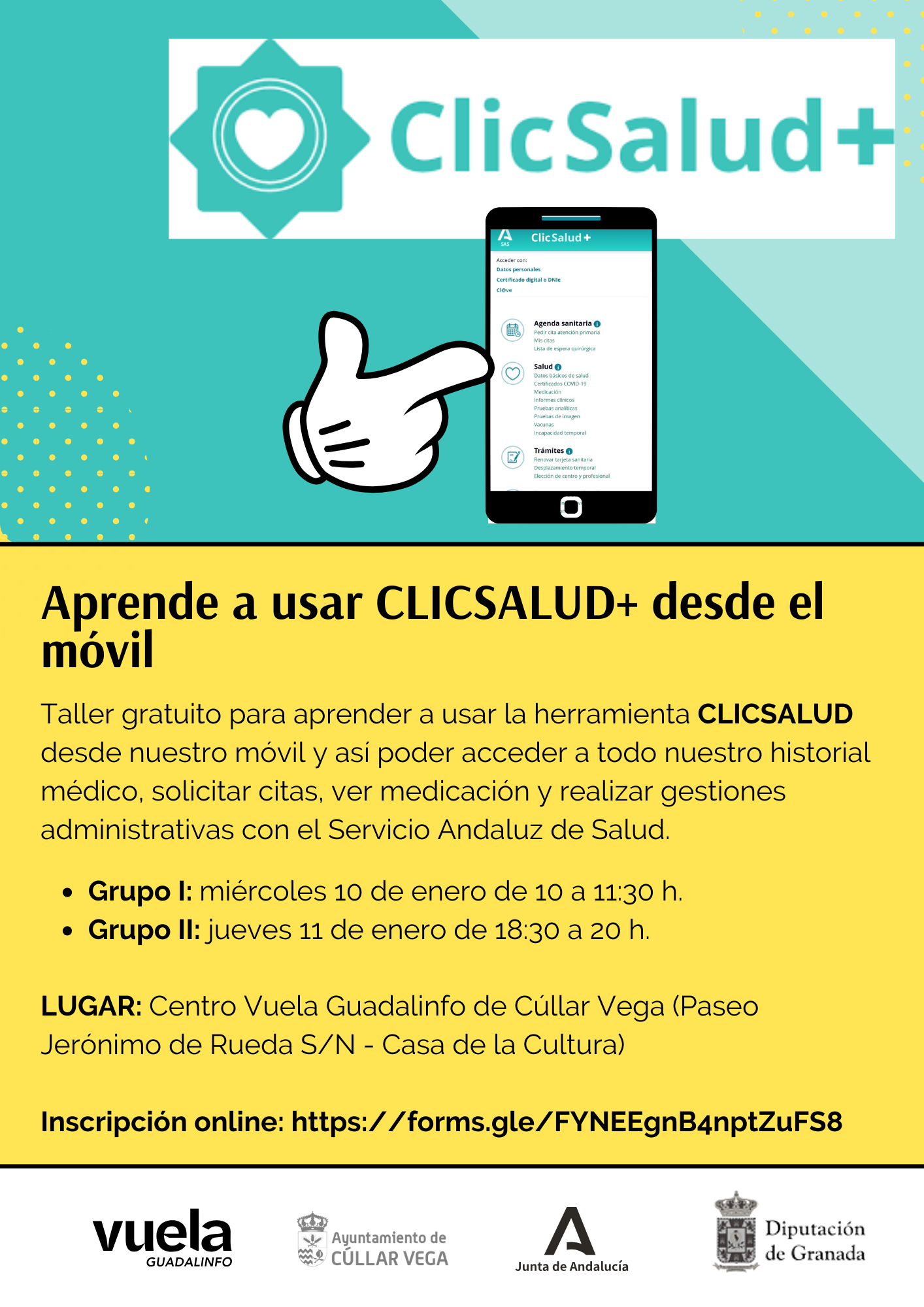 Taller gratuito para aprender a usar la herramienta CLICSALUD desde nuestro móvil y así poder acceder a todo nuestro historial médico, solicitar citas, ver medicación y realizar gestiones administrativas con el Servicio Andaluz de Salud. Se realizarán 2 grupos: miércoles 10 de enero de 2024 por la mañana y jueves 11 de enero de 2024 por la tarde Lugar de