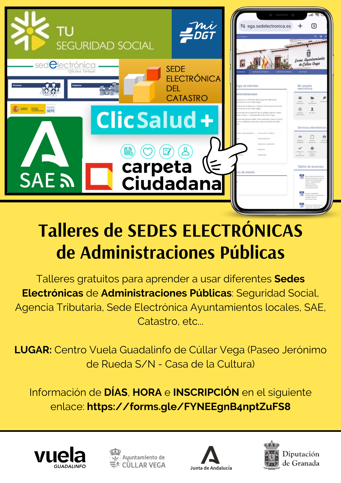 En el próximo mes de febrero de 2024 se van a organizar diferentes talleres gratuitos para aprender a usar Sedes Electrónicas de Administraciones Públicas como la Seguridad Social, Sede Electrónica de Ayuntamientos locales, Catastro, Carpeta Ciudadana, DGT, Agencia Tributaria, etc… Tendrán lugar en el Centro Vuela Guadalinfo de Cúllar Vega (Paseo Jerónimo de Rueda S/N – Casa de la Cultura)