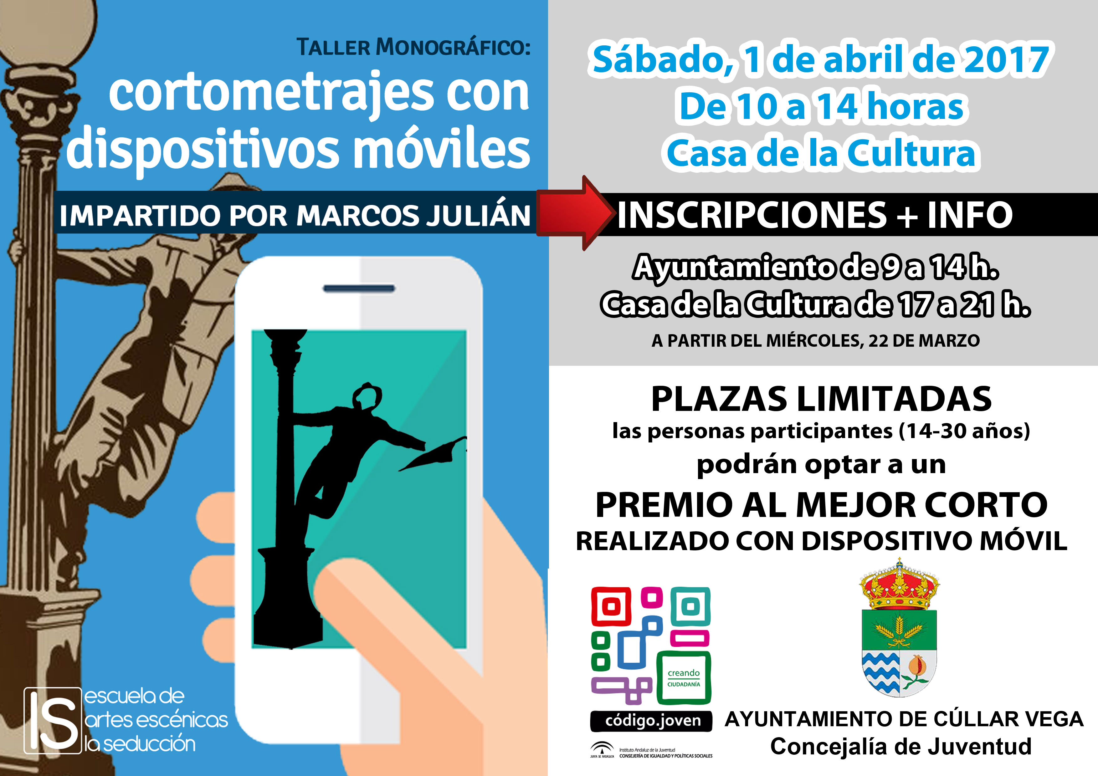 Dentro del Programa Código Jóven del Instituto Andaluz de la Juventud, la Concejalía de Juventud organiza: Taller de Creación de Cortometrajes con dispositivos móviles El Taller está dirigido a jóvenes de entre 14 y 30 años Las Inscripciones se harán tanto en el Ayuntamiento en horario de 9´00 a 14´00 horas o en la Casa de la Cultura de 17´00 a 21´00