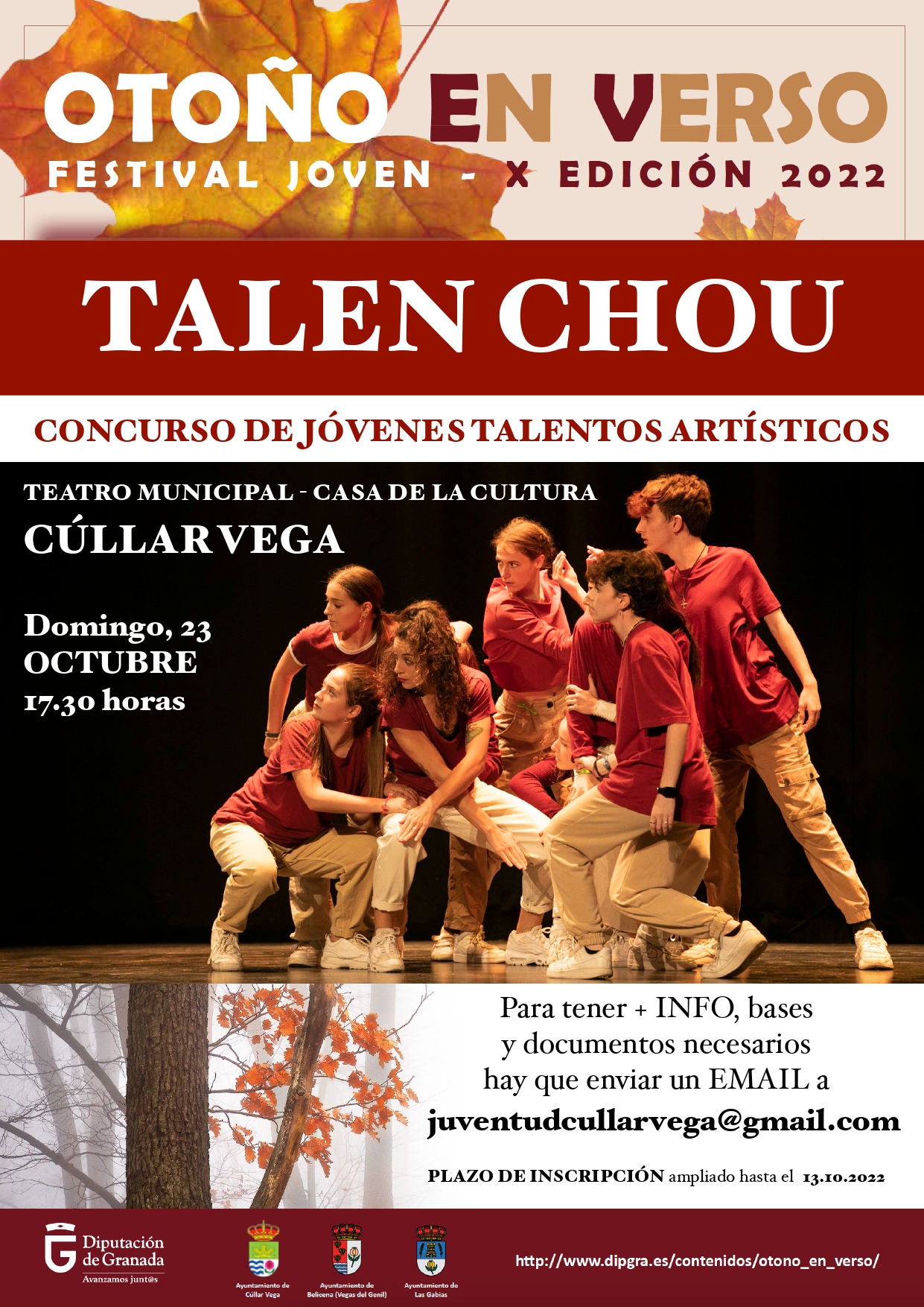 La Delegación de Igualdad y Juventud de la Diputación de Granada y los Ayuntamientos de Cúllar Vega, Las Gabias y Vegas del Genil convocan el Concurso “TALEN CHOU – jóvenes promesas del espectáculo” dentro de la programación del Festival Joven “Otoño en Verso 2022”, con arreglo a las siguientes BASES: 1. El Concurso “TALEN CHOU” tiene como objetivos ofrecer a
