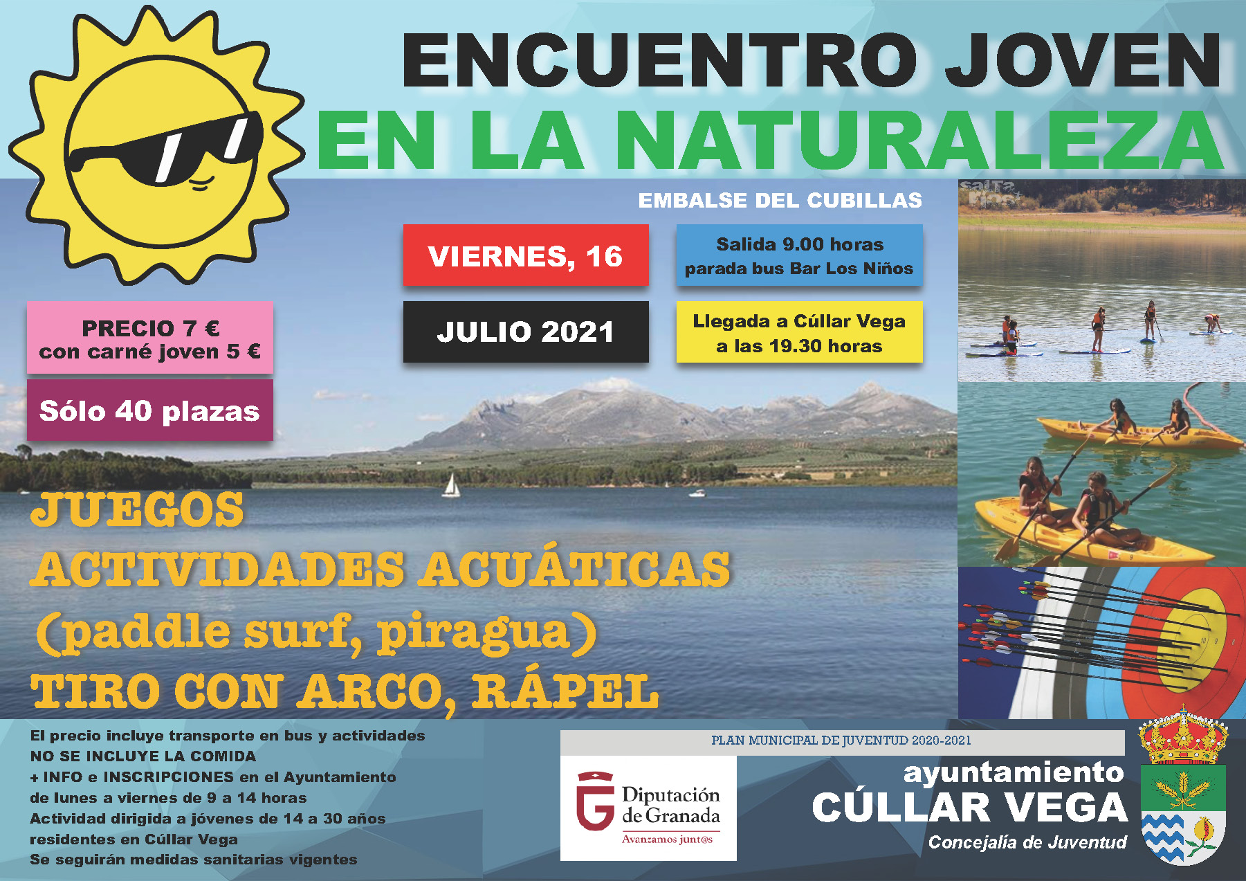 El viernes 16 de julio tendrá lugar un Encuentro con la naturaleza dirigida a jóvenes de 14 a 30 años residentes en Cúllar Vega, con juegos, actividades acuáticas (paddle surf, piragua), tiro con arco y rápel en el entorno del embalse de Cubillas. Plazas limitadas (solo 40) Precio: 7 € (5€ con carne joven) El precio incluye transporte en bus
